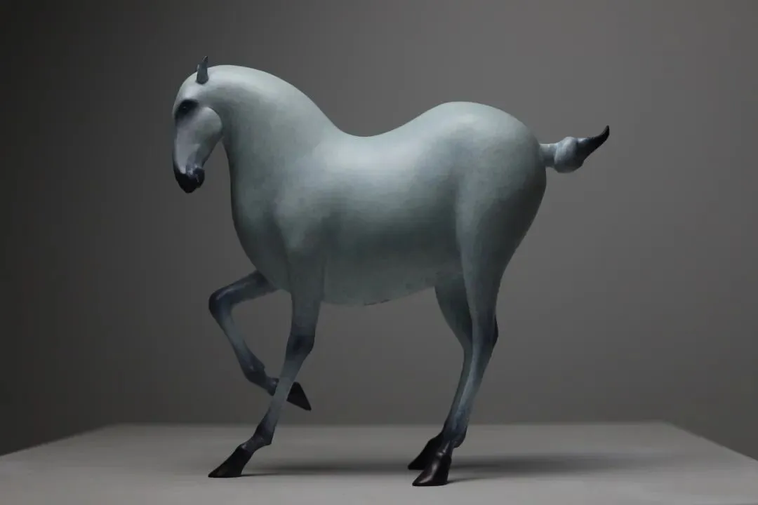 《踏歌行》灵感来源于古诗“大漠沙如雪,燕山月似钩,何当金络脑快走踏清秋”,有踏歌前行,驰骋清秋之意,踌躇满志的一种状态,作品形体采用圆润概括的手法使马形体完整一体,借用国画中的流线型线条感,想达到一种独具中国诗的韵味与张力。