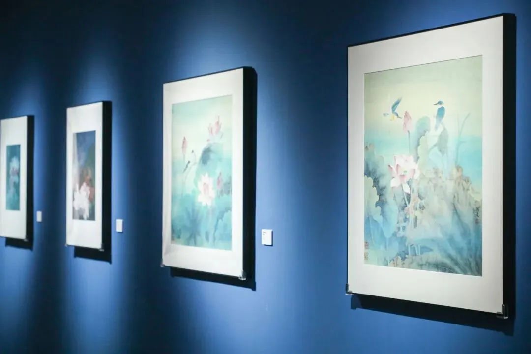 深蓝色区域为展览第一单元“格物澄明之境”,主要呈现我的工笔作品,其中荷花题材居多。我生长于湖南,湖湘“芙蓉国”的印记与早年荷塘生活的记忆,成为这些创作的情感源头。