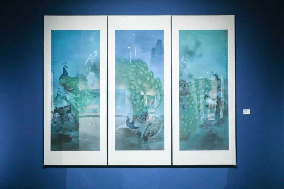 同时展出的工笔孔雀系列,其精细笔触与湛蓝底色在环境中相得益彰。孔雀作为吉祥象征,在新春之际展出,亦是对观众的美好祝愿。