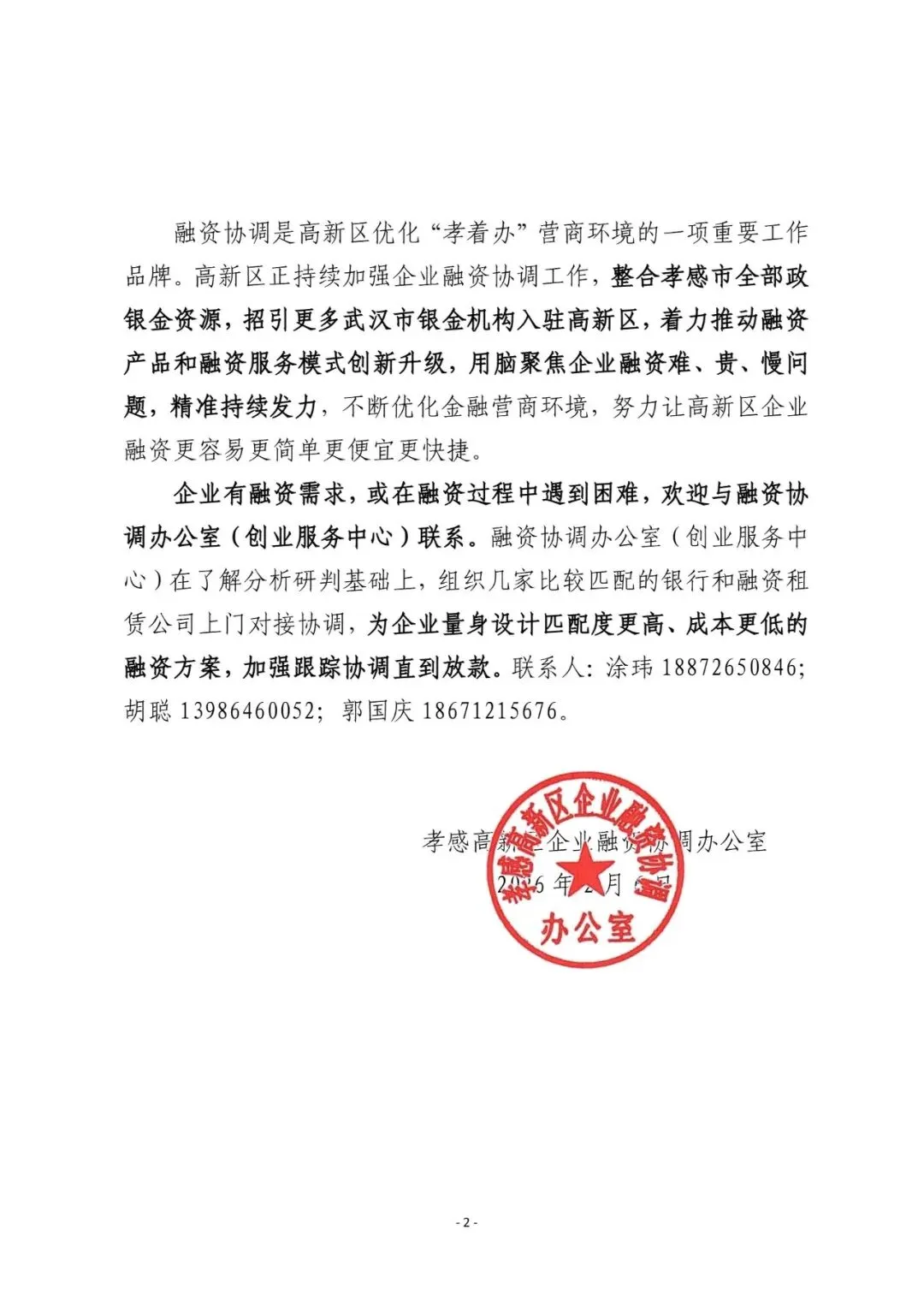 融资协调是高新区优化“孝着办”营商环境的一项重要工作品牌。高新区正持续加强企业融资协调工作,整合孝感市全部政银金资源,招引更多武汉市银金机构入驻高新区,着力推动融资产品和融资服务模式创新升级,用脑聚焦企业融资难、贵、慢问题,精准持续发力,不断优化金融营商环境,努力让高新区企业融资更容易更简单更便宜更快捷。