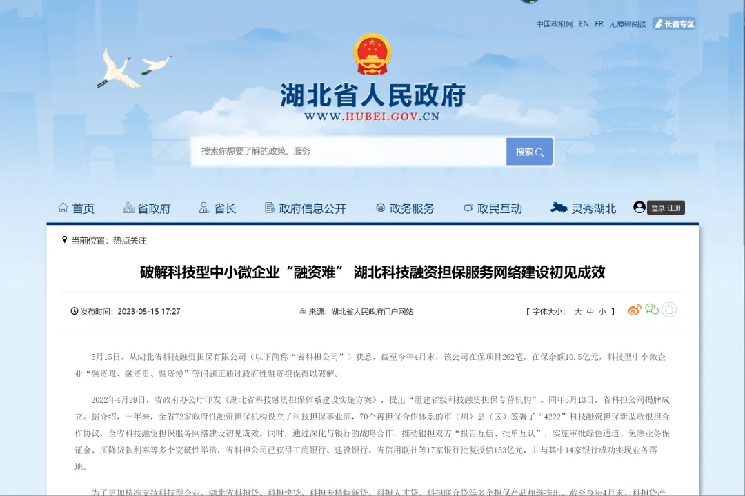 5月15日,湖北省政府官网刊发《破解科技型中小微企业“融资难” 湖北科技融资担保服务网络建设初见成效》,专题报道公司助力我省高水平自立自强“科技强省”建设的先进做法和工作成效。