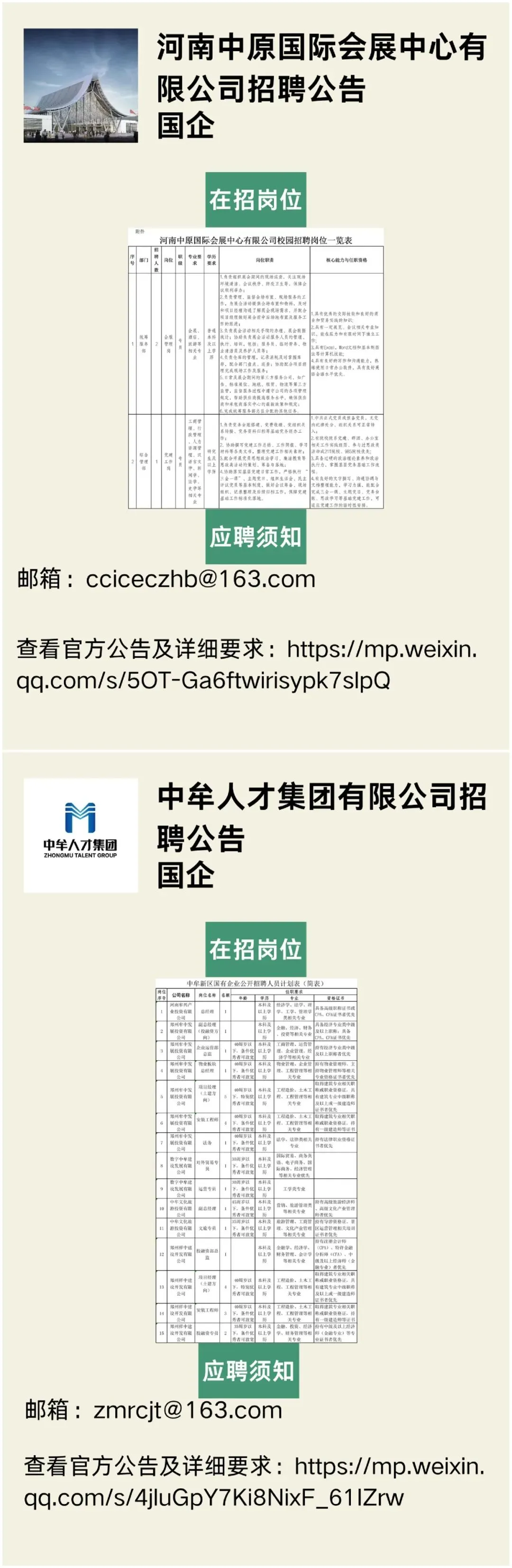 来源|河南中原国际会展中心有限公司,中牟人才集团有限公司。(声明:“河南省大中专毕业生就业创业促进会”微信公众号刊载此文,是出于传递更多信息之目的。若有来源标注错误或侵犯了您的合法权益,请及时与我们联系,我们将及时更正、删除或依法处理。)