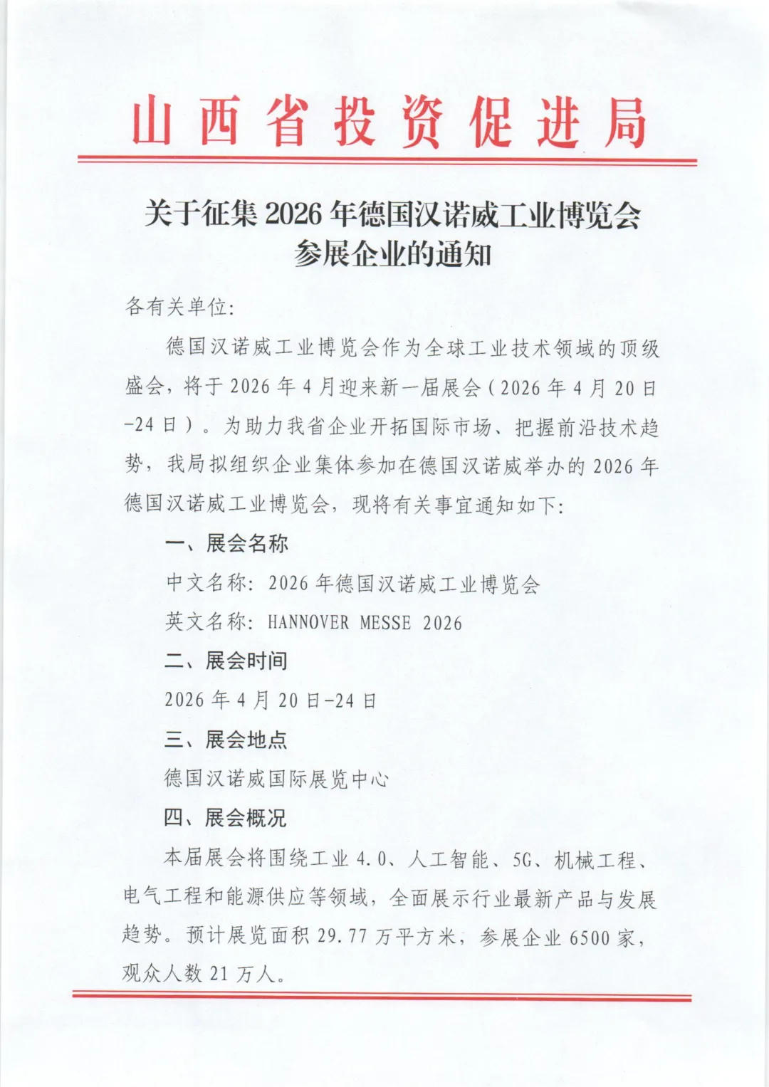 关于征集2026年德国汉诺威工业博览会参展企业的通知