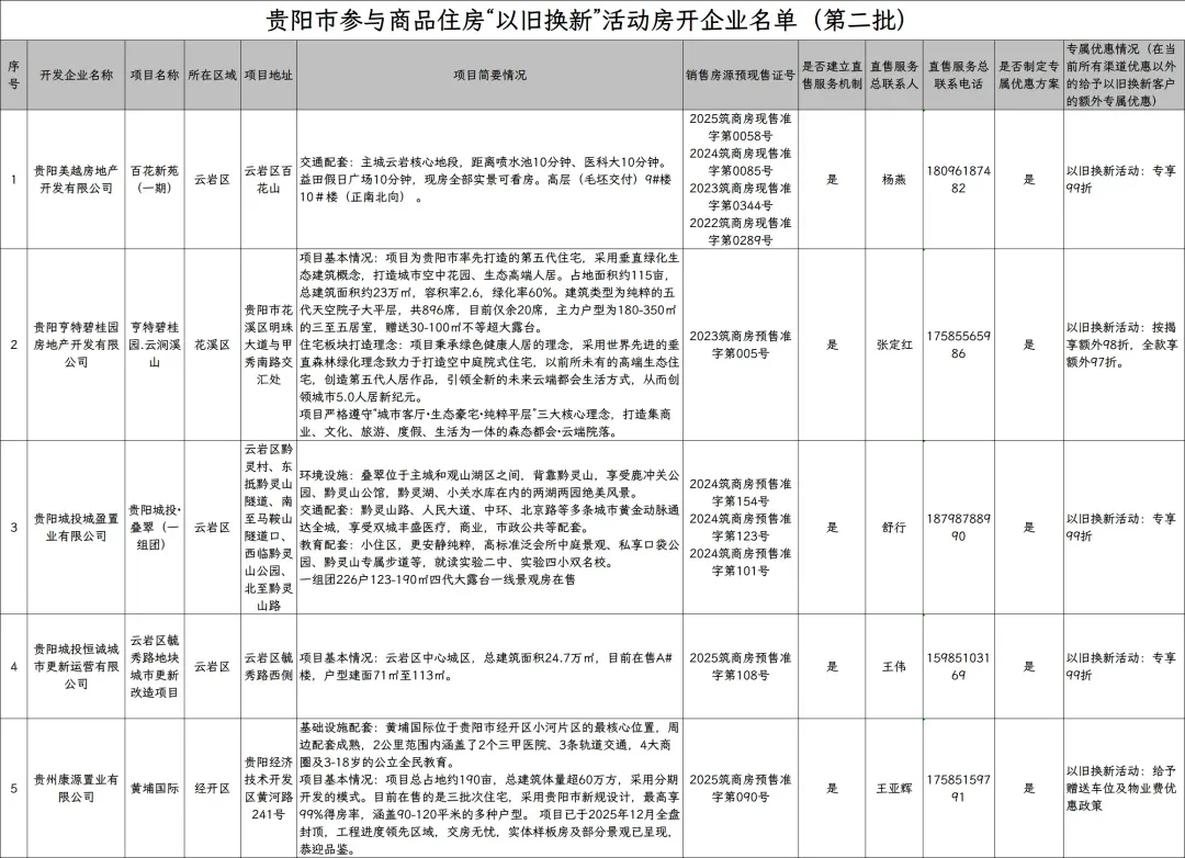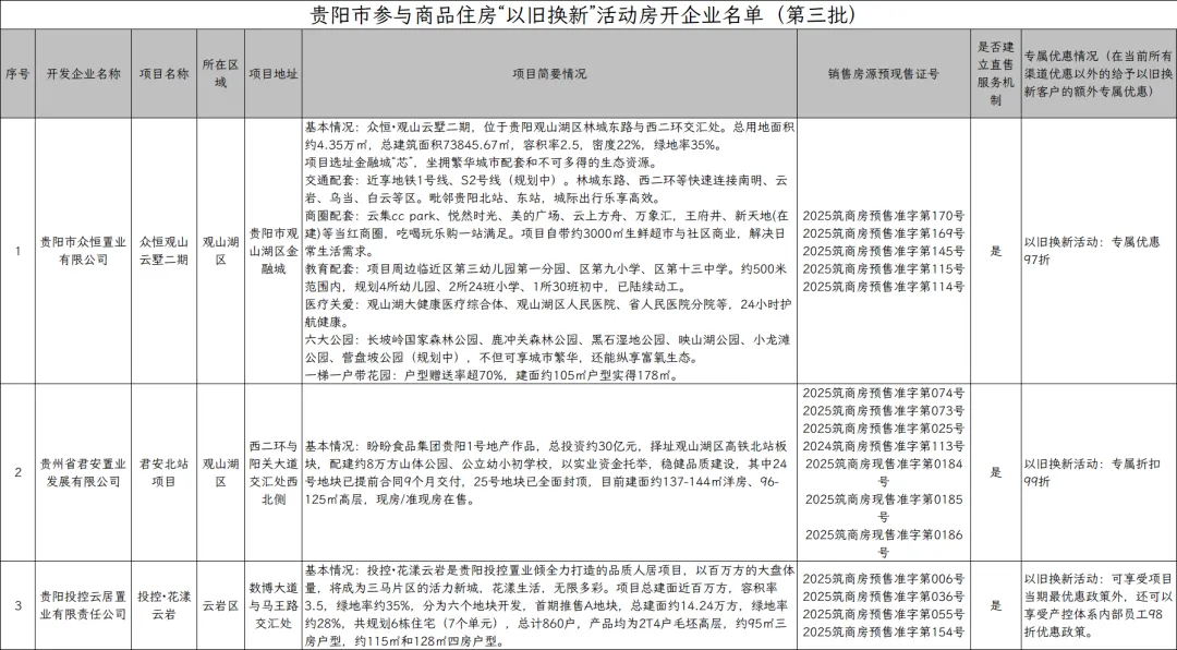 2026年2月6日,贵阳市住建局公示了第三批参与贵阳市商品住房“以旧换新”房地产开发企业及项目名单。