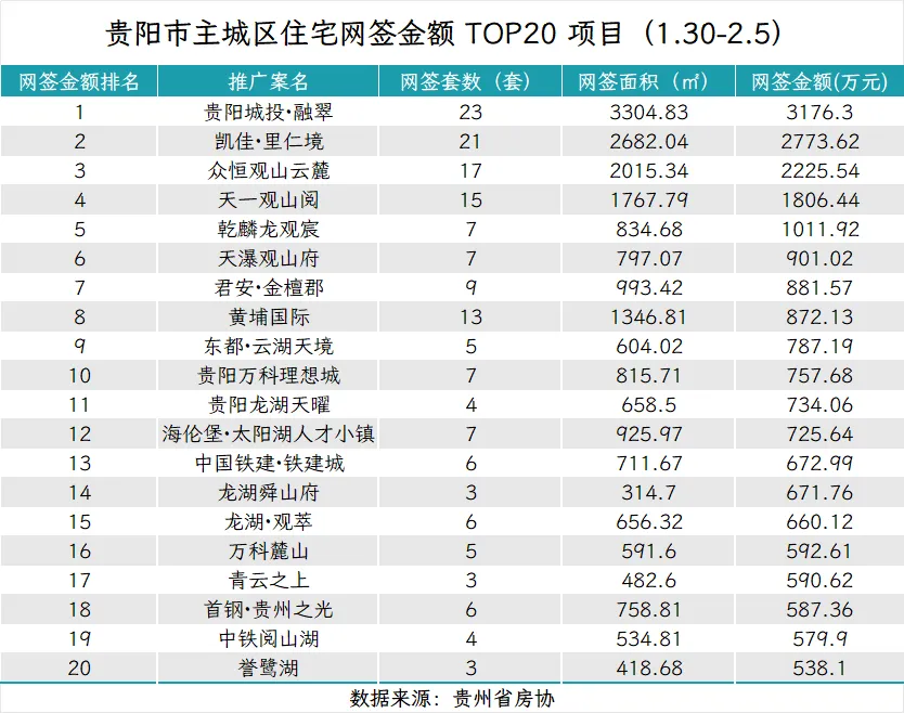据贵州省房协统计数据,2026年1月30日至2026年2月5日,贵阳主城六区住宅网签金额榜单中: