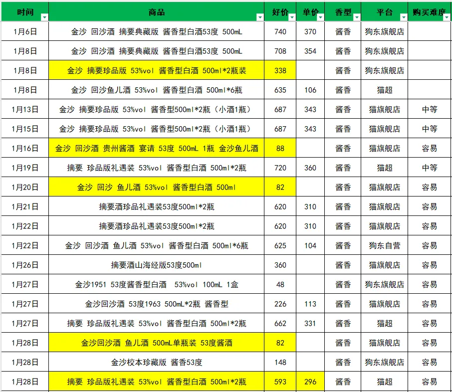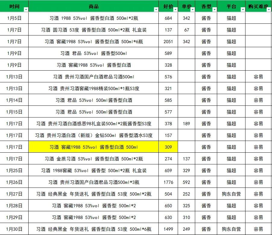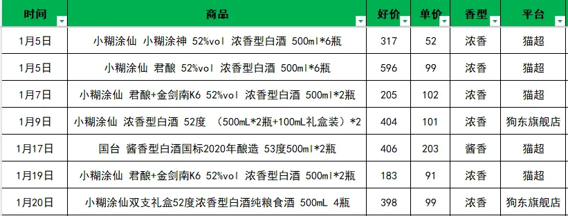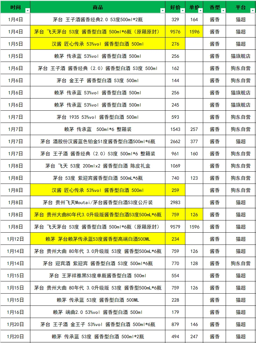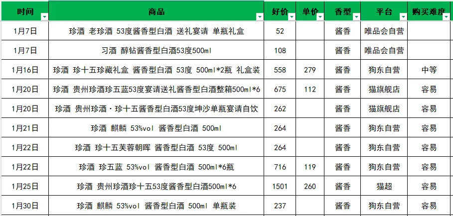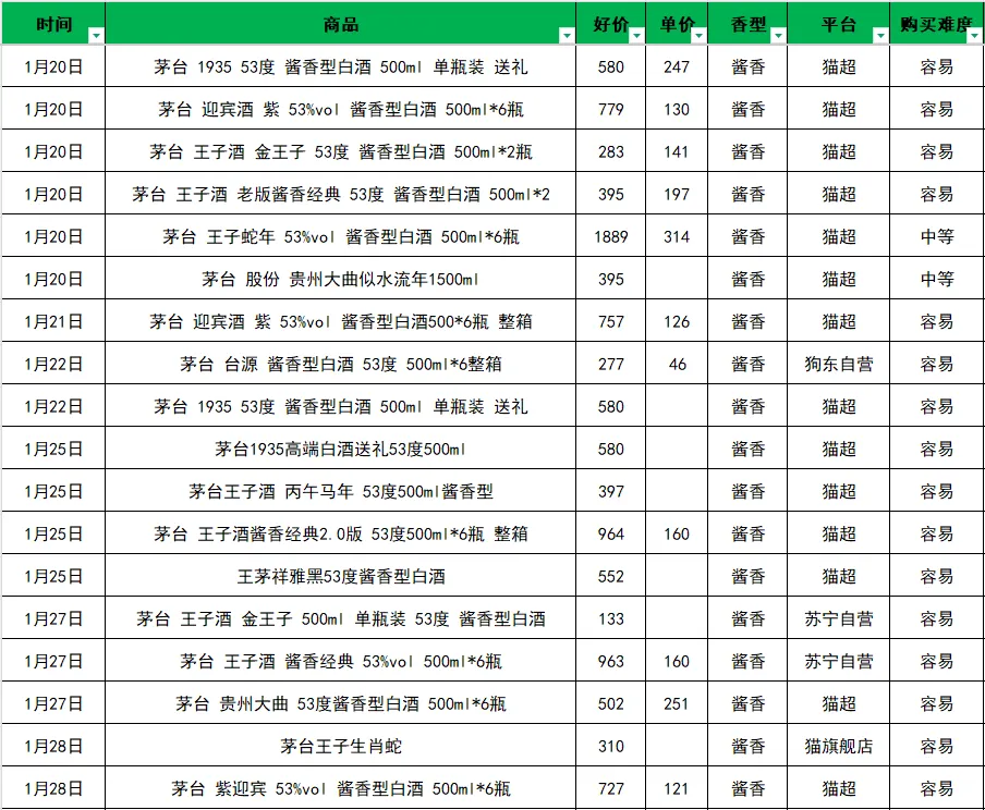 一月已过,这一期我们来看一下在过去的1月里贵州省都有出现了哪些值得入手的品牌白酒好价。离春节还有10来天,各平台的年货节已经开启,有需要过年买酒送礼的,现在可以开始关注了。1月贵州白酒出现的白酒好价品牌主要有茅台,习酒,珍酒,金沙,小糊涂仙,国台这6大品牌。好价是指:品牌产品通过各种折扣叠加后的价格,需要等的哦,并且一般有数量限制,这里的好价参考特指【品牌自营店】。1、茅台 王子酒酱香经典2.0(¥160-197)5、金沙 回沙酒 摘要典藏版 (¥354-370)以上则是贵州省各大名酒的品牌自营好价,有需要的可以关注实时好价、建议大家优先选择品牌自营,第三方有一定概率买到假货。对于有名酒需求的,可以提前做好计划,等待平台促销,买好价,能省则省。如果是急需用酒的,建议优先选择品牌自营,以防买到假货。想要买好酒,买好价酒,就关注我哦。