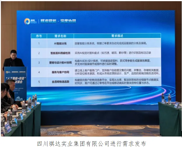 会议围绕“需求发布-技术推介-签约合作-精准洽谈”展开。需求侧企业代表四川琪达实业集团有限公司进行需求发布;供给侧企业代表四川云知声智能科技有限公司、工赋(德阳)科技有限公司进行产品推介。签约仪式上,四川琪达实业集团有限公司与四川云知声智能科技有限公司,德阳永盛无纺制品有限公司与工赋(德阳)科技有限公司进行“诊断赋能”签约;四川云上天府科技有限公司与四川虹信软件股份有限公司进行区域协同发展签约。在随后的“一对一”精准匹配洽谈环节中,供需双方企业围绕具体应用场景展开深度交流,多家企业达成初步合作意向。