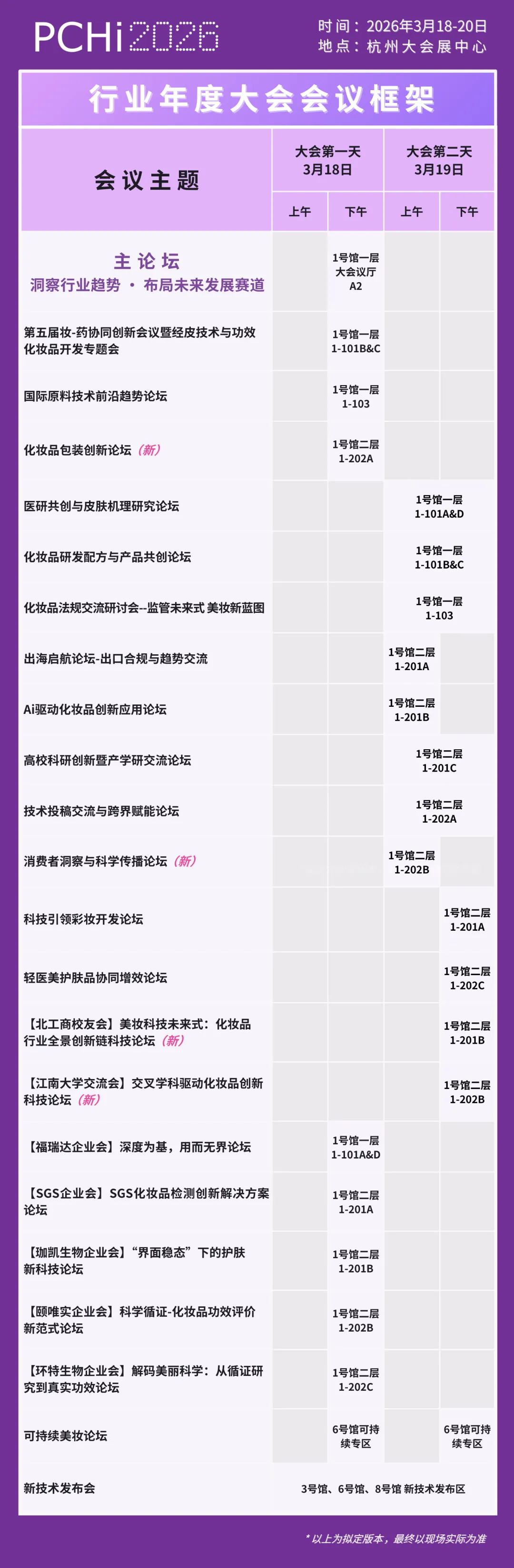 PCHi2026行业年度大会作为中国化妆品行业的年度技术盛会,将与展览同期,于2026年3月18-20日在杭州大会展中心拉开序幕!大会议题经行业权威智囊团-PCHi专家委员会CSTIC专家指导,拟定从政策法规、原料技术、产品配方、功效评价、市场趋势、出海趋势、医美护肤、彩妆创新、科学传播、人工智能应用、皮肤科学与临床应用、包装设计、前沿科学与基础研究、高校学术成果转化、跨界领域技术 等多角度展开,呈现行业创新研究成果,与行业携手,共创新生。