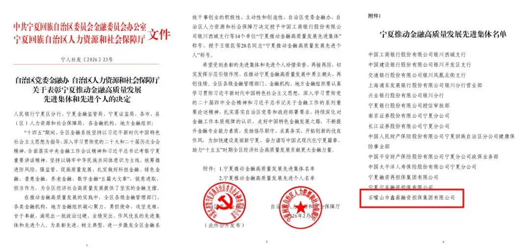 近日,自治区党委金融办、自治区人力资源和社会保障厅联合发布的表彰名单中,石嘴山市鑫鼎融资担保集团有限公司光荣获评“宁夏推动金融高质量发展先进集体”称号,成为全区14个获此殊荣的单位之一!这是对鑫鼎集团践行金融工作的政治性与人民性的高度认可和鼓励。