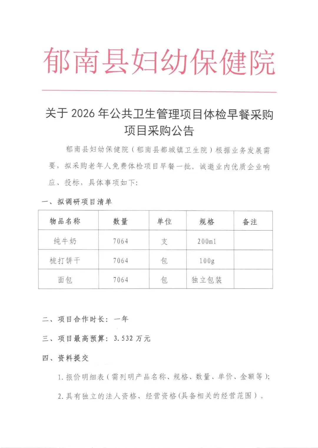 关于2026年公共卫生管理项目体检早餐采购项目采购公告