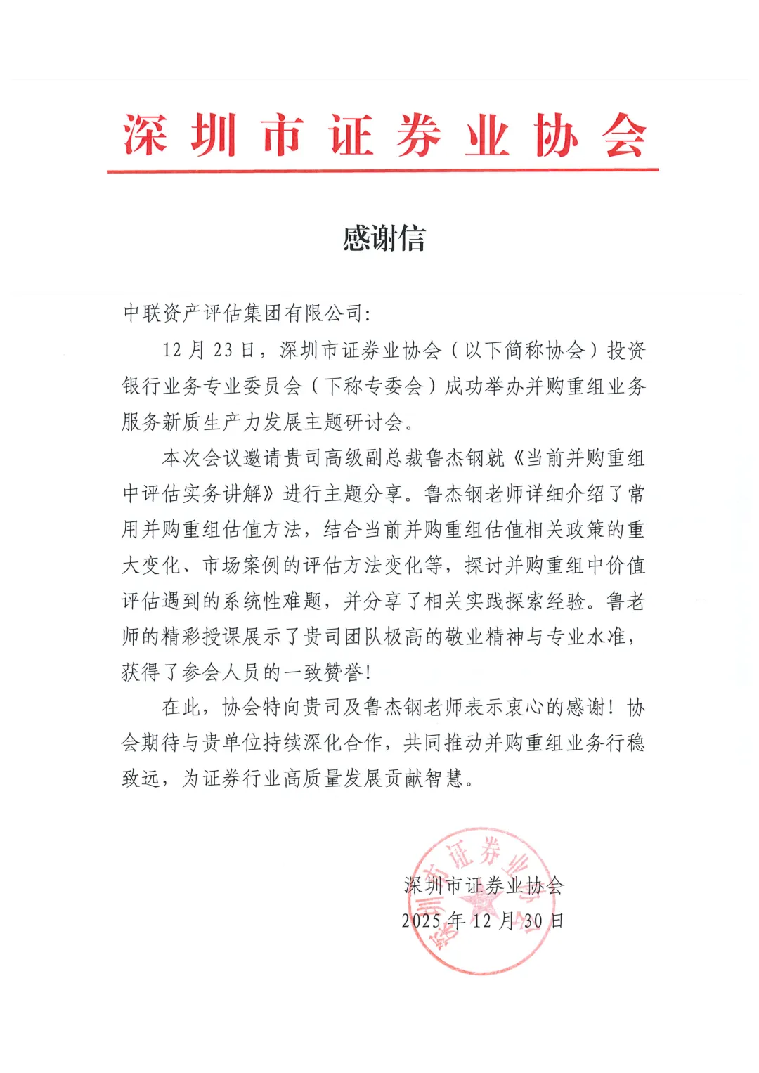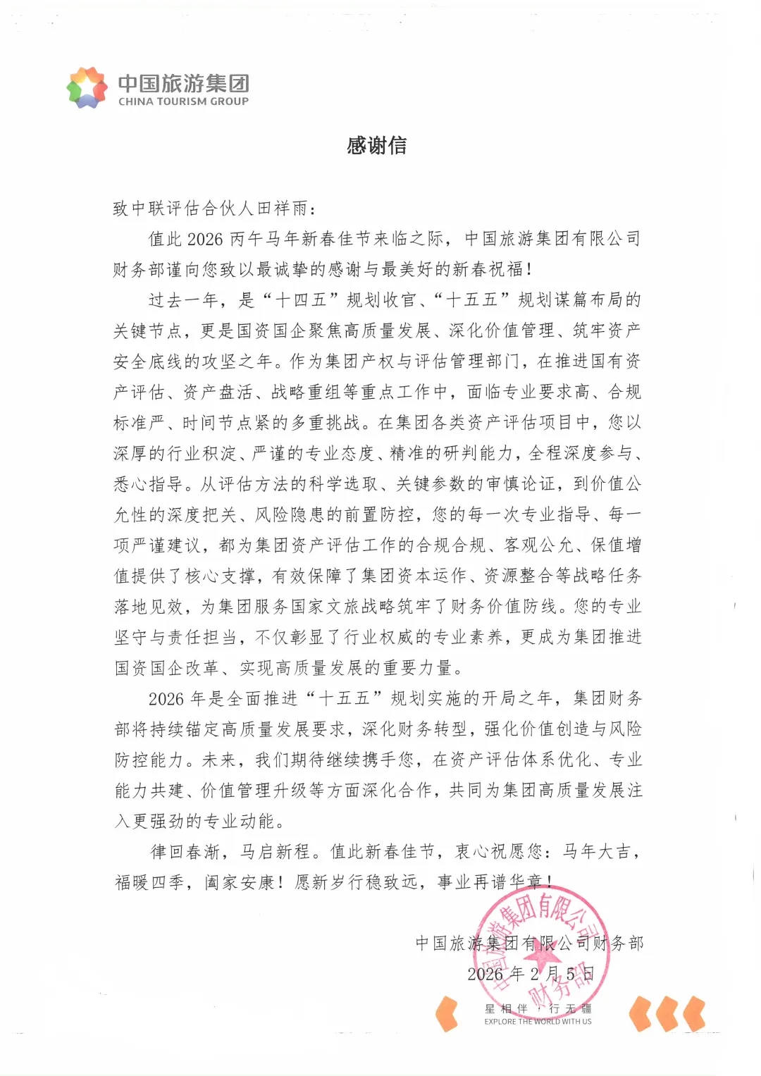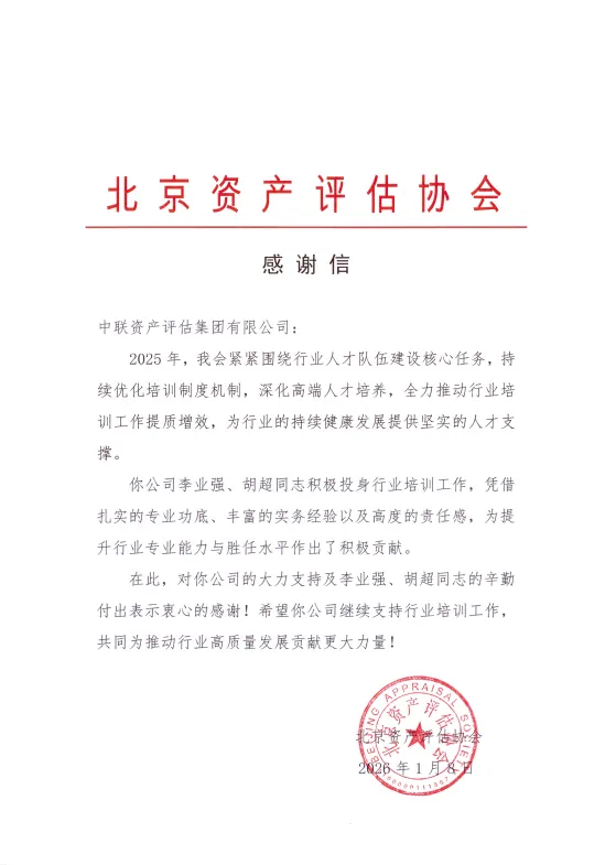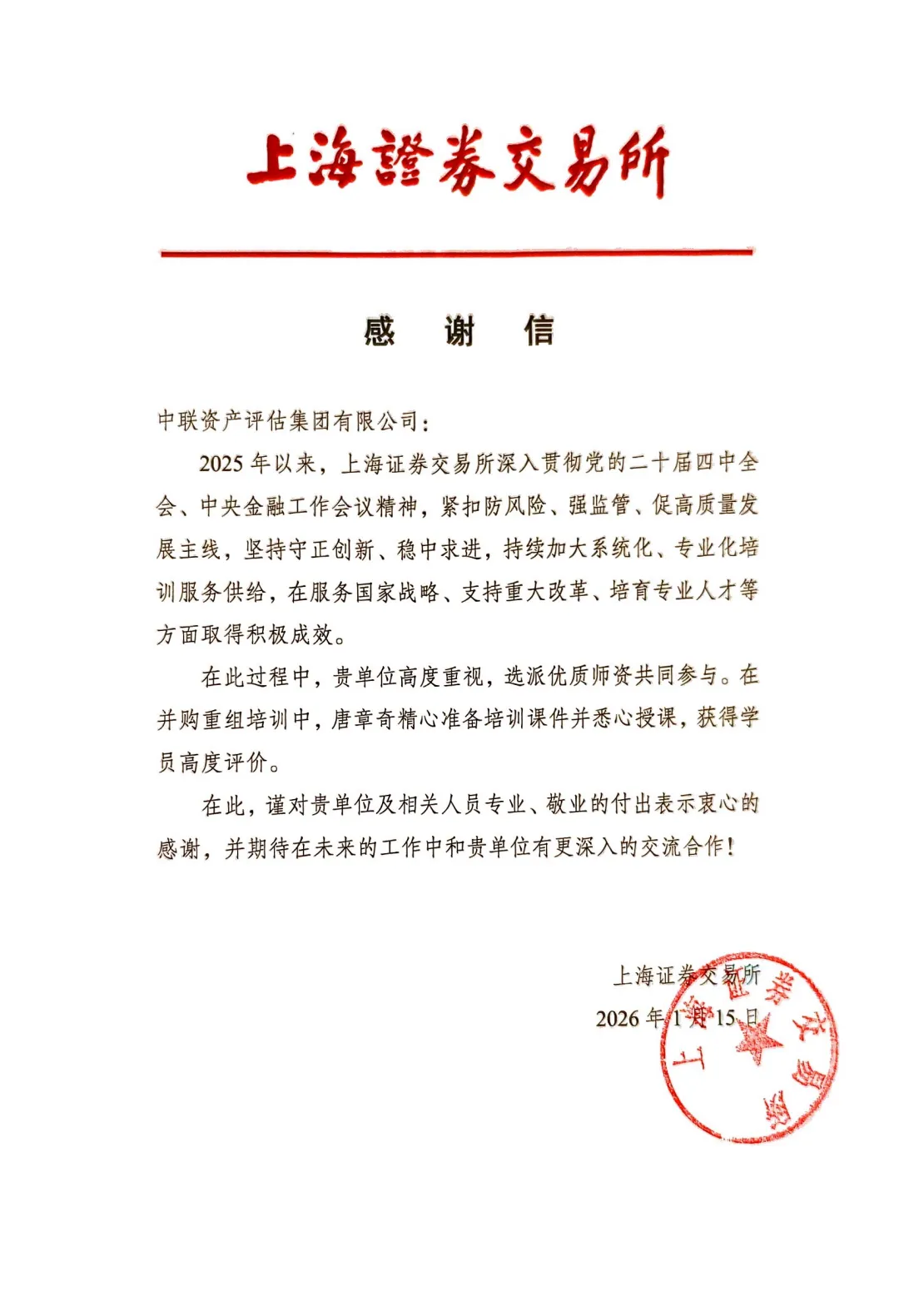 过往一年,中联资产评估集团在财政、国资、证监等部门以及证券交易所、行业协会指导下,秉持至精至诚、共创共荣的理念,充分发挥资产评估价值尺度和价值管理专业优势,在行业建设、专业研究、价值服务、咨询建言等诸多领域倾心付出、协同共创,用行动默默奉献,用实绩赢得认可。感谢信中,各方对中联资产评估集团的专业能力、责任担当、服务质效给予高度肯定,也对未来持续深化合作、共促行业发展寄予厚望。