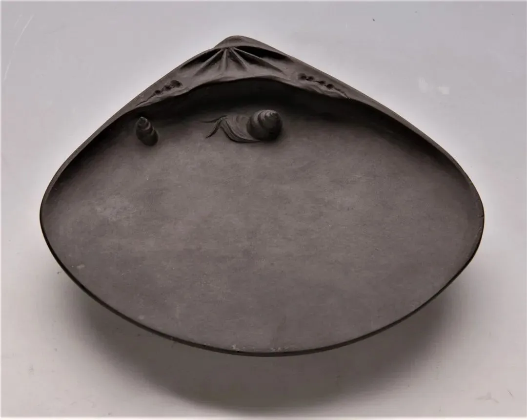 老坑石。石色青灰微带紫蓝。砚形雕如蚌壳,上饰二小螺,颇具生趣。