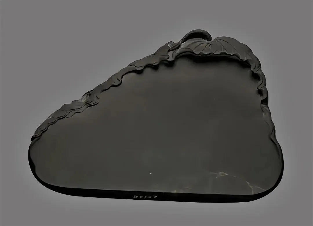 老坑石。石色青灰微带紫蓝。石品花纹绚丽多姿。砚背随形巧雕梧桐叶纹,生动别致。