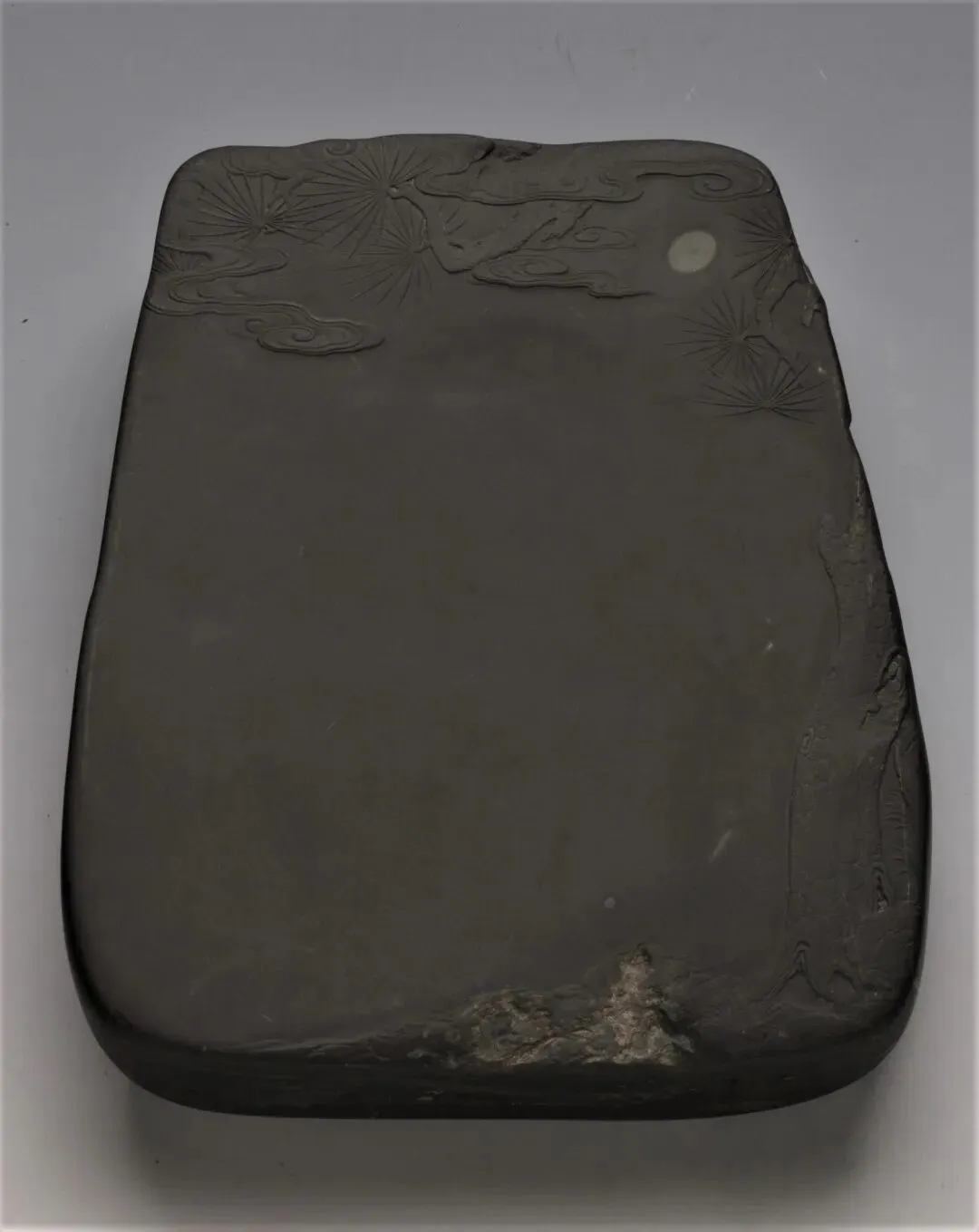 老坑石。石色青紫。刻工随自然石色浮雕山石松云。衬石眼为皎月,悬于松云之间,颇得“明月松间照”之意。