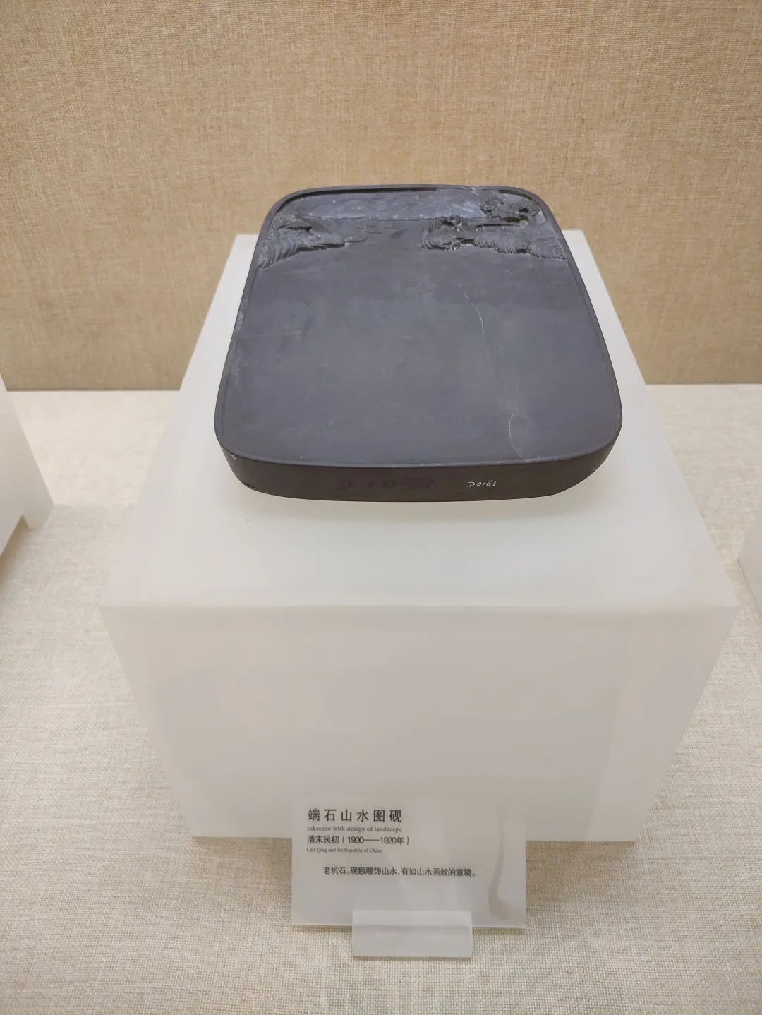 老坑石。石质致密坚实。有翡翠纹。雕工依砚材的自然形态,刻成山崖洞石之状。