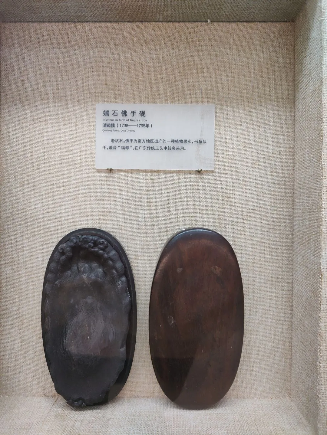 老坑石。石色青灰稍带紫蓝。砚堂遍布金线。砚作佛手形,形状逼真。佛手为南方地区出产的种植物果实,形象似手,谐音“福寿”,在广东传统工艺中较为常见。岩则从宋代治平年间(1064—1067 年)开始采石。