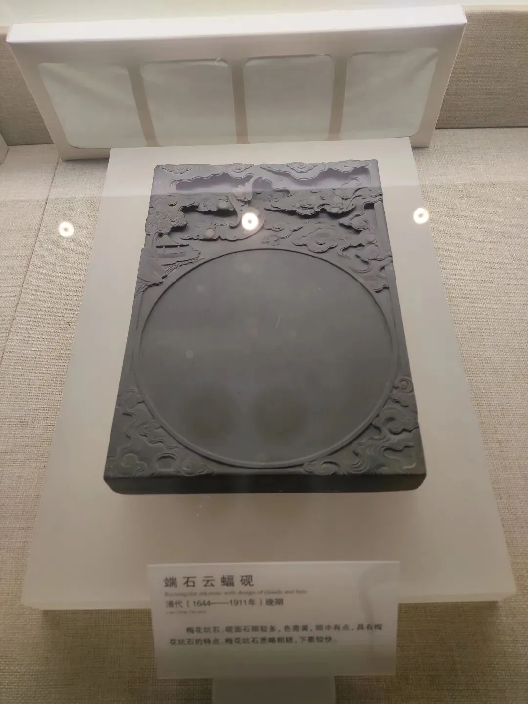 麻子坑石。石色青紫偏蓝。砚石中有鱼脑冻、胭脂火捺和石眼数颗。砚面与砚侧刻云蝠纹,雕工古朴,富有动感。