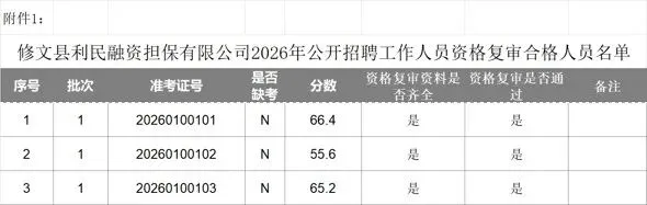 详见《修文县利民融资担保有限公司2026年公开招聘工作人员资格复审合格及进入面试环节人员名单》(附件)。