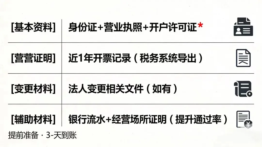 · 基本资料:法人身份证、营业执照、企业开户许可证。