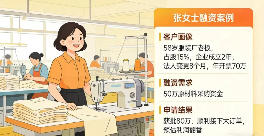 让我举个广州本地例子。张女士在番禺经营一家服装厂,成立两年,她占股15%,年龄58岁。年前接到一笔大订单,但原材料采购缺50万周转金。她起初担心年龄大、占股少贷不到款。但京东企业主贷的新条件让她符合资格:企业成立超18个月,她变更法人已8个月,开票金额年约70万。在我的协助下,她一周内获批80万,顺利接下订单,预估利润能翻一番。