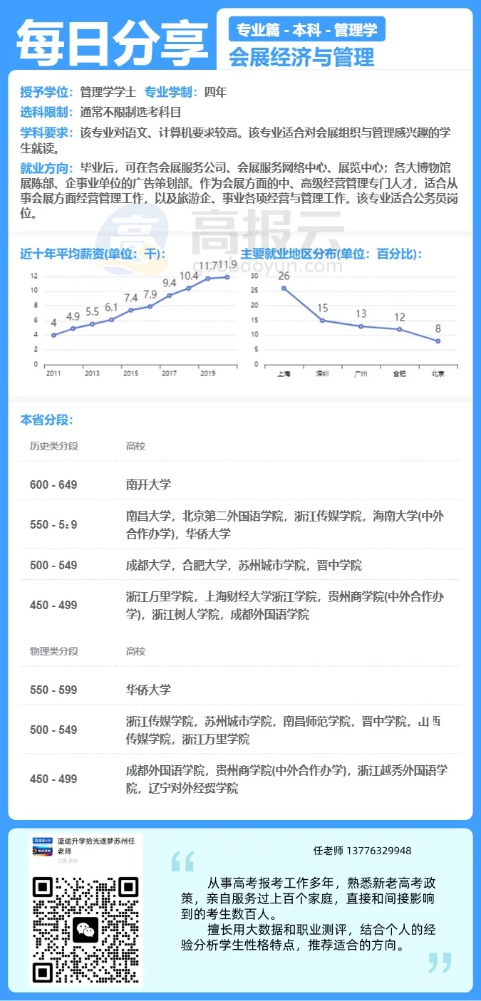 会展经济与管理,是指由于会展业而带动的相关产业,并形成商机无限的全新行业经济。作为现代化服务业的门类之一,会展业能带动交通运输业、物流业、建筑业、商业、广告、旅游、金融等相关行业的发展。广阔的发展前景和良好的发展机遇,为会展经济与管理人才创造了良好的外部环境,已经成为各国经贸交流的重要渠道。本专业培养具备管理、经济、法律及工商管理(会展管理)方面的知识和能力,具有较强的外语和计算机运用能力,能在企、事业单位等相关部门从事会展营销、会展招展、会展项目开发与管理、会议组织与管理、展位设计等岗位以及教学、科研方面工作的工商管理类会展商务管理高级应用性专门人才。