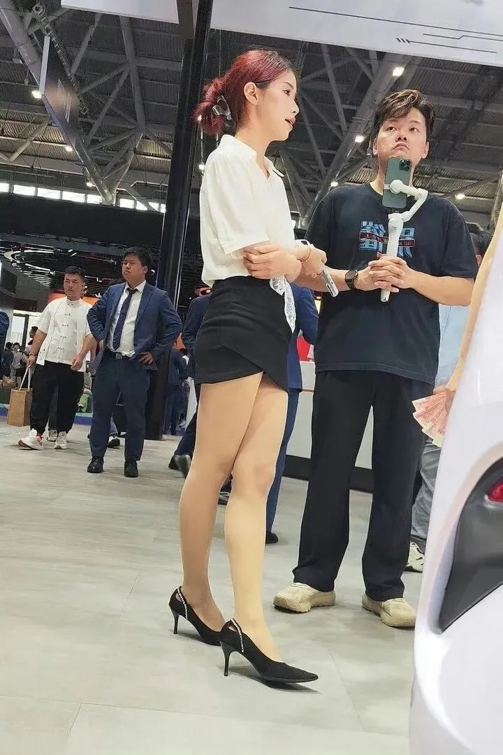来.到车展现场.,她遇到.了同样.对汽车感.兴趣.的朋友。.两人在展.厅内.热切交流,.红发.女孩的.穿搭在展.车的映衬.下更显.气质。她那.双带水.钻装饰的黑.色尖头高.跟鞋在光.滑的.地面上熠熠.生辉,.每一.走步都.散发出.自信的.光芒。薄.款的.肉色.丝袜.让双腿线.条更.加修.长,整套.搭配.在展厅.的专业环境.中显得得体.而不失.时尚感。