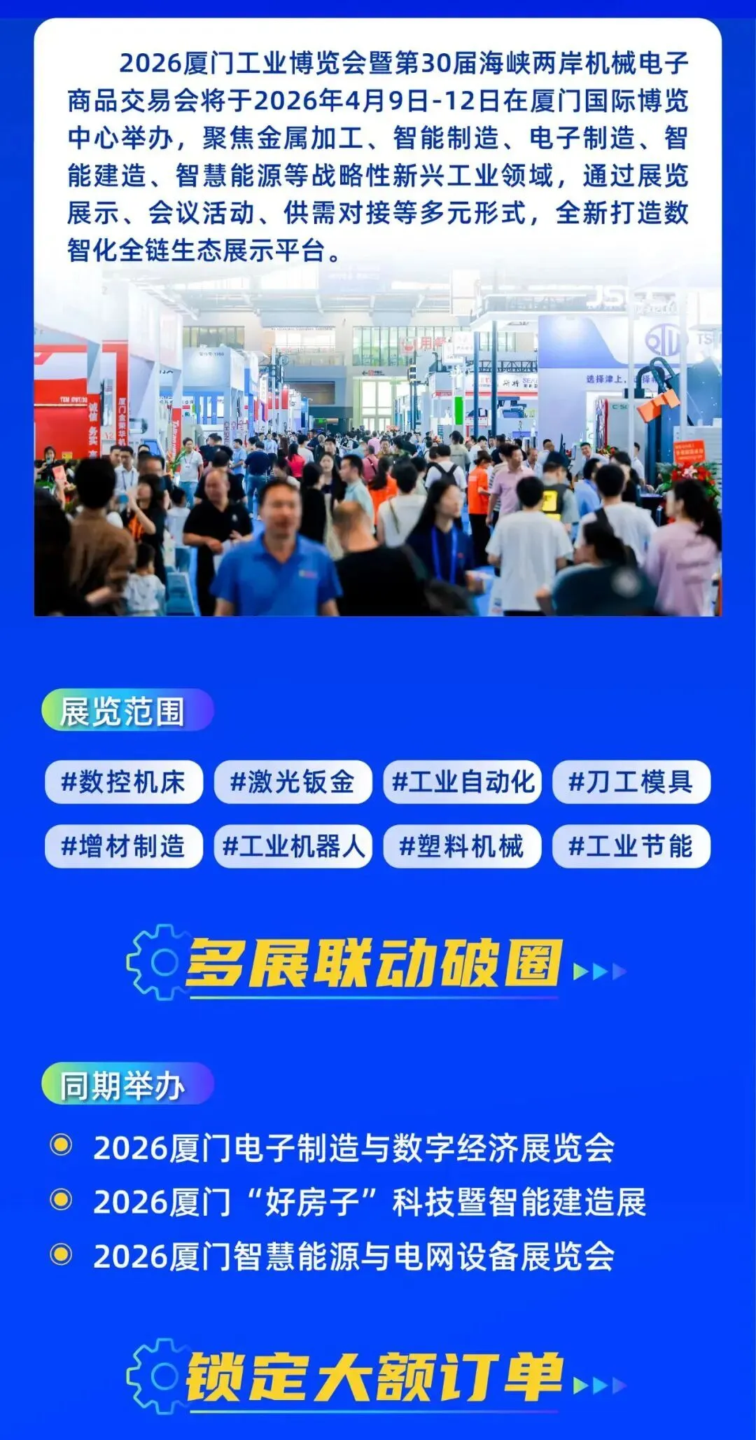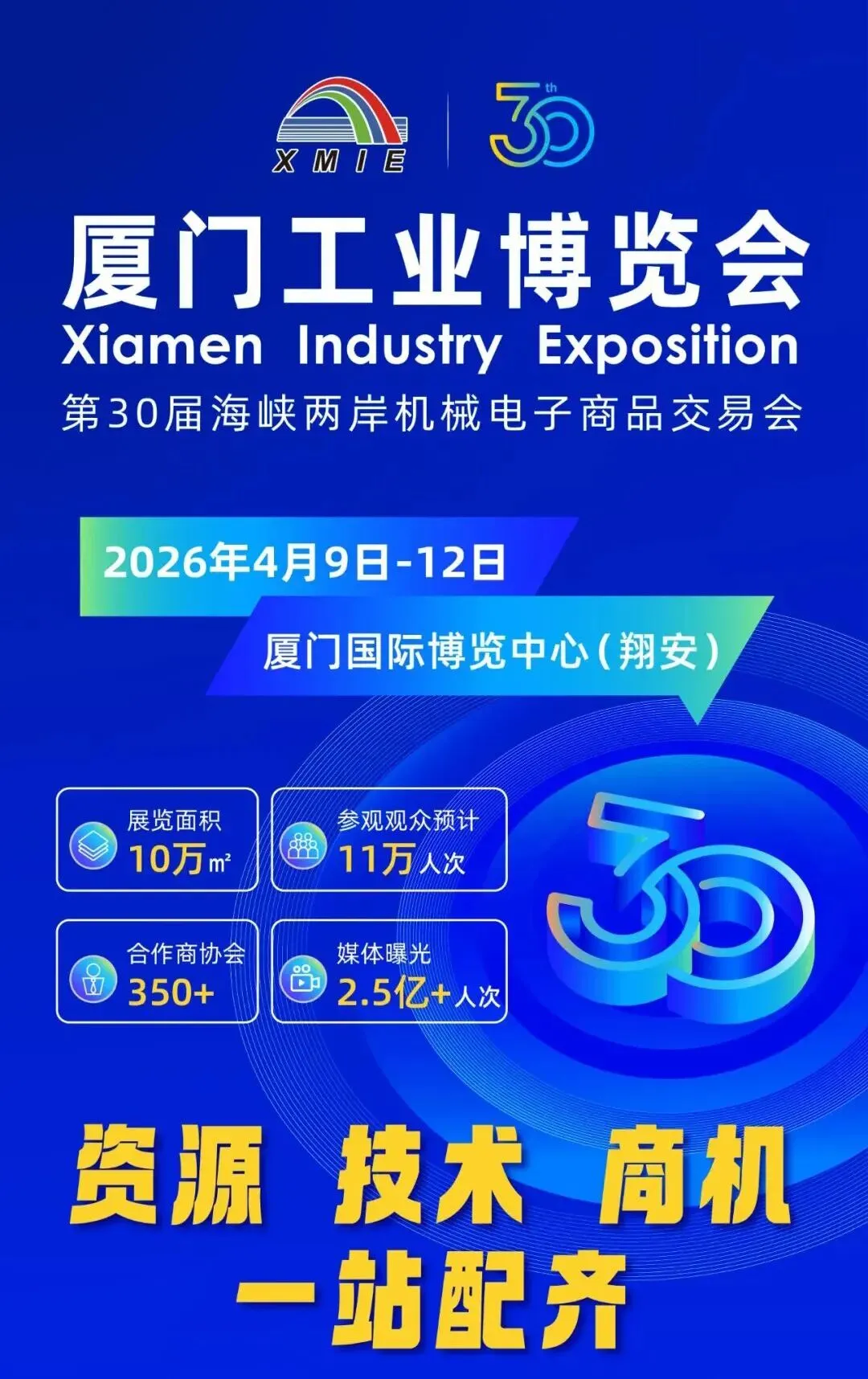 携手两岸,共拓全球市场。值此30届里程碑之际,2026厦门工博会定档4月9-12日,聚焦智能制造、工业互联网、新能源等战略性新兴工业领域,汇聚全球工业力量,通过展览展示、会议活动、供需对接等多元形式,全新打造数智化全链生态展示平台,深度贯通“研→造→用→创”,驱动制造业数字化转型升级和高质量发展。