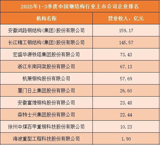 根据申万行业分类,2025年1-3季度中国钢结构行业上市公司按营业收入排名如下:(A股上市公司)