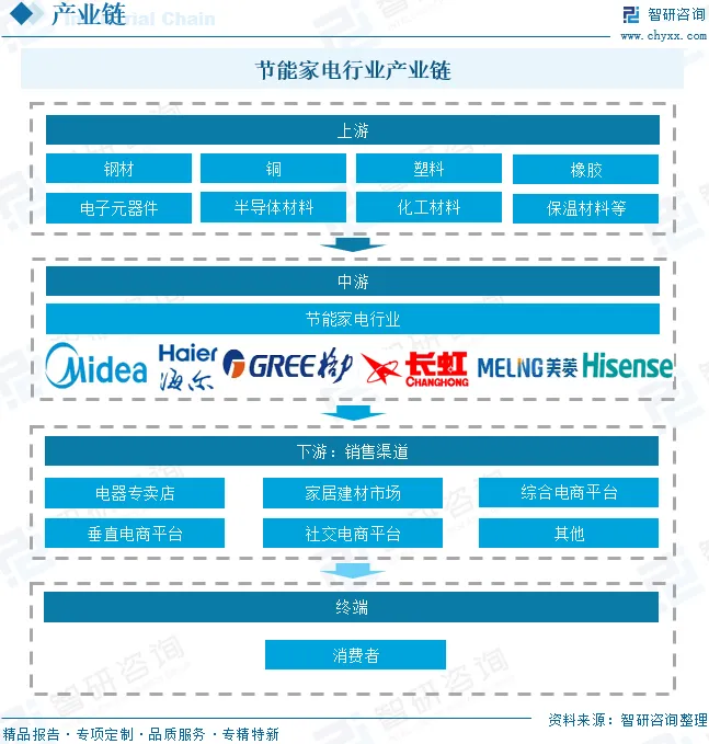 节能家电产业链上游为原材料和零部件,主要包括钢材、铜、塑料、橡胶、电子元器件、半导体材料、化工材料、保温材料等。产业链中游为节能家电的生产制造环节。产业链下游为销售渠道,包括电器专卖店、家居建材市场、综合电商平台、垂直电商平台、社交电商平台等。终端为消费者。