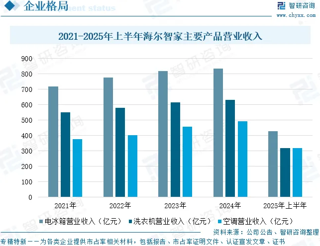 海尔智家股份有限公司自1984年成立以来,始终致力于成为时代的企业,通过不断推出引领市场的创新产品,持续创新迭代,把握行业机遇。经过40多年发展,公司已经成为全球大家电行业的领导者和全球智慧家庭解决方案的引领者。公司连续16年蝉联全球大型家用电器品牌零售量第一名。公司拥有全球家电品牌集群,包括海尔、卡萨帝、Leader、GE Appliances、Candy、Fisher&Paykel及AQUA。2008年至2024年,海尔品牌冰箱、洗衣机零售量在全球大家电品牌中分别连续17年和16年蝉联第一。依托全品类的家电产品优势,公司是业内首批推出智慧家庭解决方案的家电企业之一。三翼鸟持续聚焦“智慧家生活,让家更美好”的使命,围绕智慧家庭场景方案创新、场景体验店、智家大脑技术突破等三大核心能力建设,坚持为用户提供主动、专业、深度、定制化的智慧家庭解决方案。据统计,2025年上半年,海尔智家电冰箱营业收入为425.17亿元,同比增长4.06%;洗衣机营业收入为316.45亿元,同比增长7.54%;空调营业收入为316.45亿元,同比增长9.08%。
