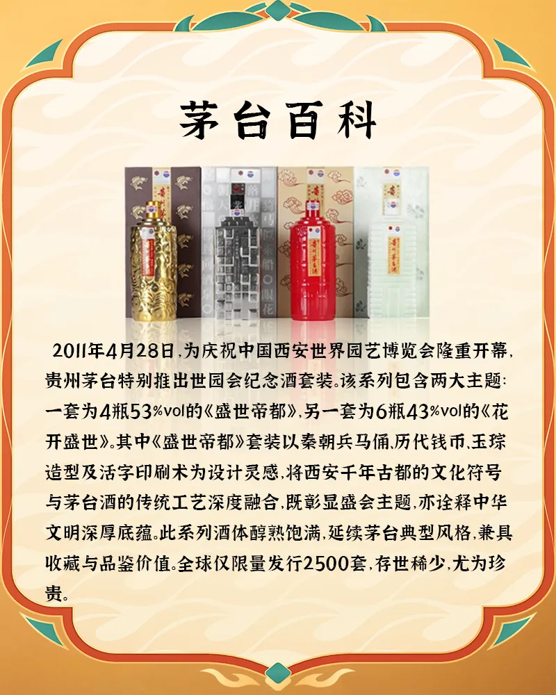 2011年4月28日,为庆祝中国西安世界园艺博览会隆重开幕,贵州茅台特别推出世园会纪念酒套装。该系列包含两大主题:一套为4瓶53%vol的《盛世帝都》,另一套为6瓶43%vol的《花开盛世》。其中《盛世帝都》套装以秦朝兵马俑、历代钱币、玉琮造型及活字印刷术为设计灵感,将西安千年古都的文化符号与茅台酒的传统工艺深度融合,既彰显盛会主题,亦诠释中华文明深厚底蕴。此系列酒体醇熟饱满,延续茅台典型风格,兼具收藏与品鉴价值。全球仅限量发行2500套,存世稀少,尤为珍贵。