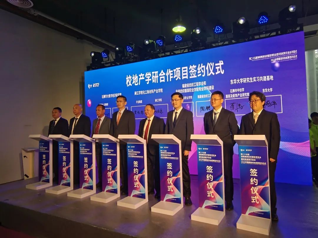 2023年4月18日-20日,由石狮市人民政府主办,中国纺织工程学会协办的首届“科创中国”纺织服装科技成果交易会在泉州石狮召开。我院受中国纺织工程学会邀请前往参展。开幕式上,学院与石狮市中纺学服装及配饰产业研究院签署了校级研究生实习基地建设协议。
