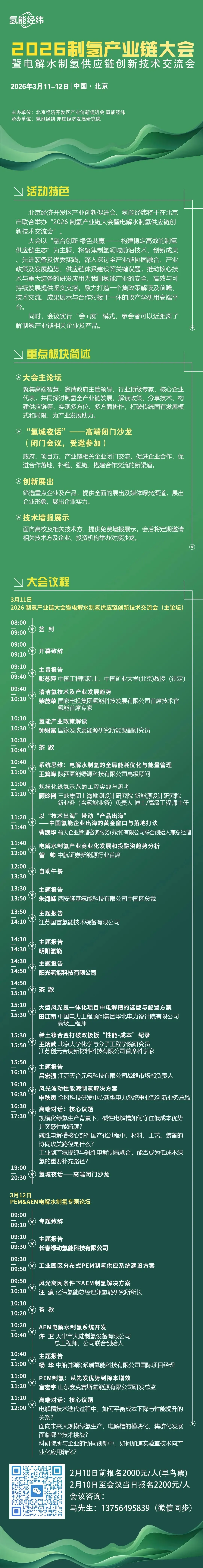 2026年3月11-12日,北京经济开发区产业创新促进会、氢能经纬将于在北京市联合举办“2026 制氢产业链大会暨电解水制氢供应链创新技术交流会”。