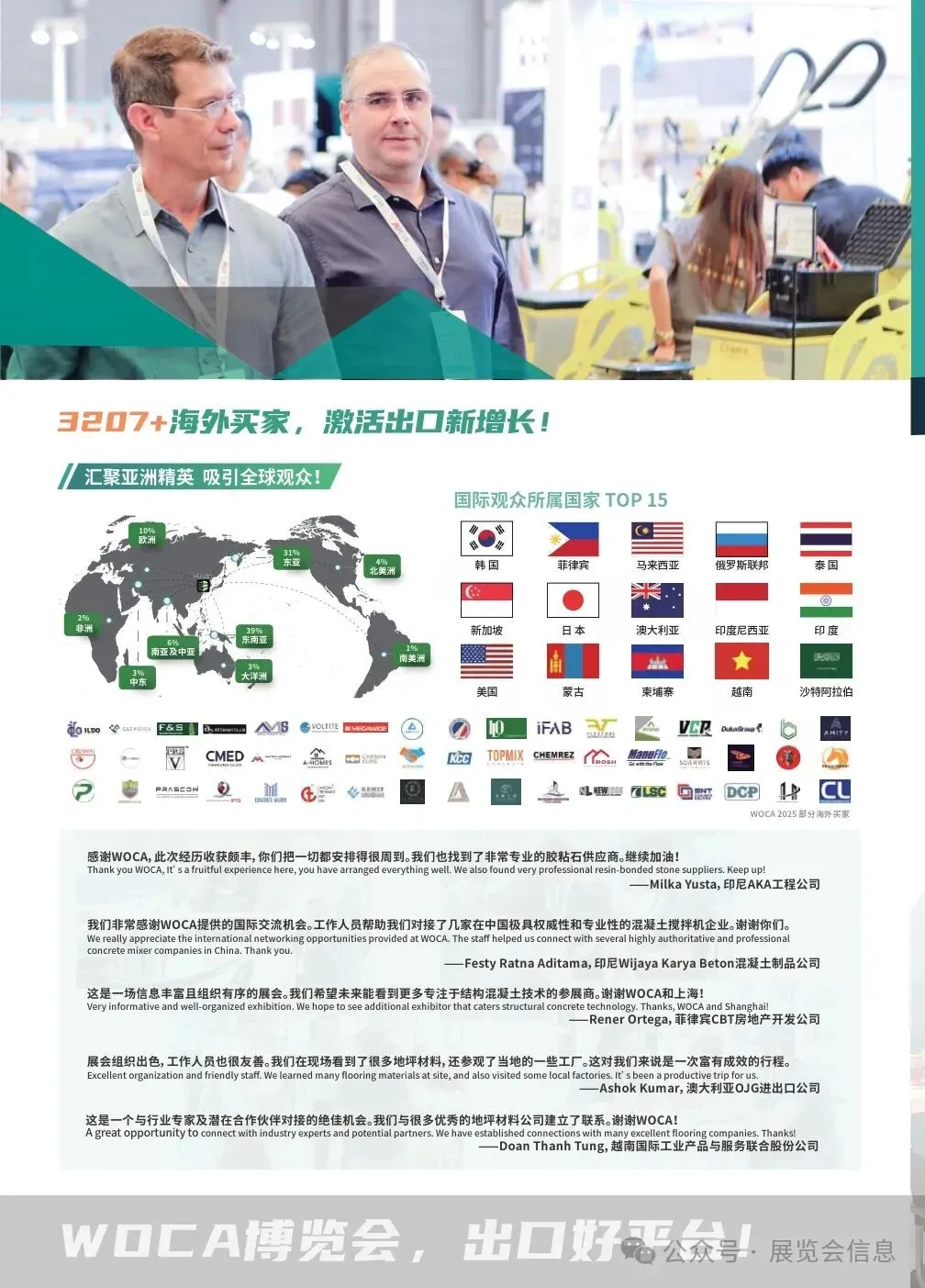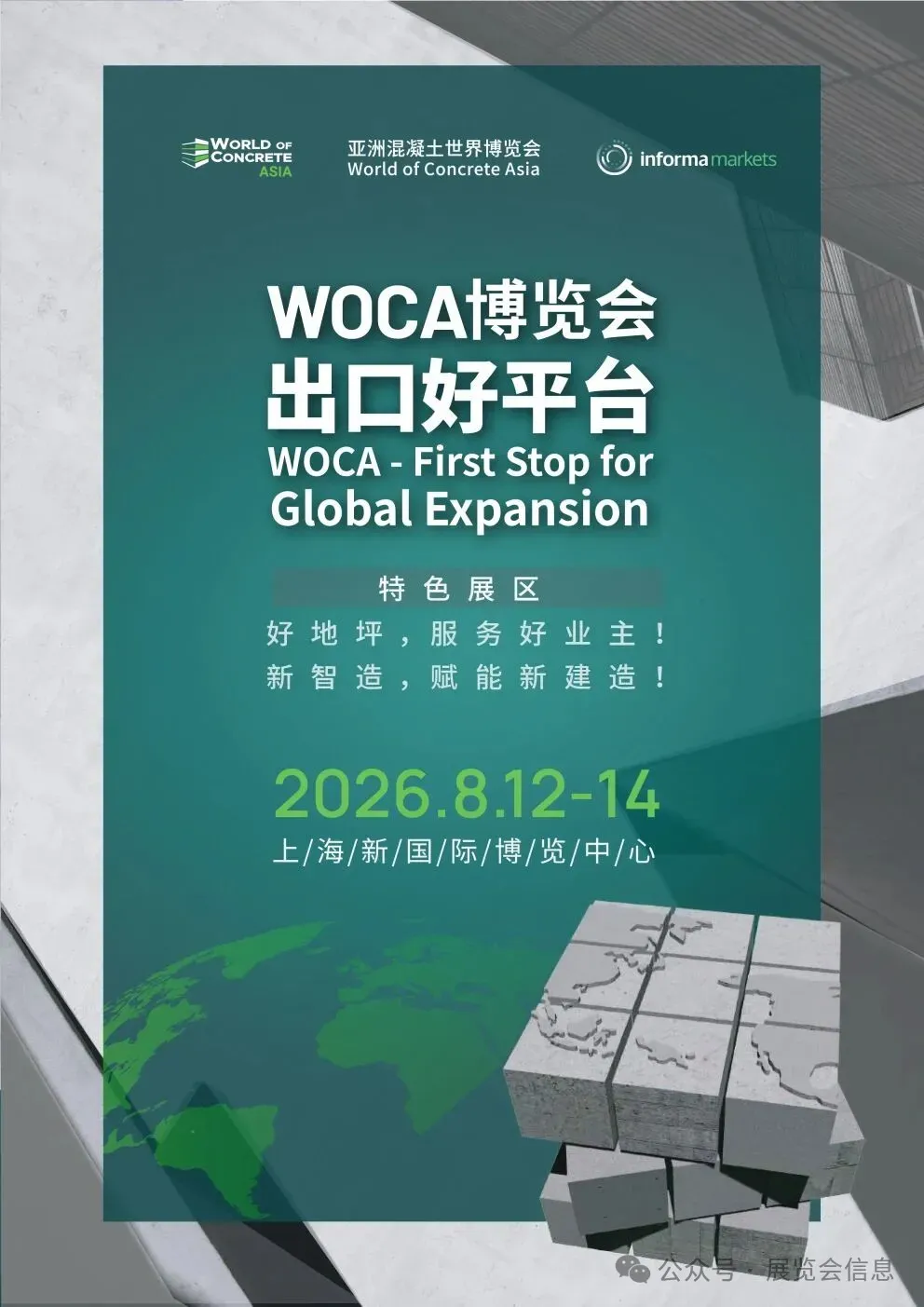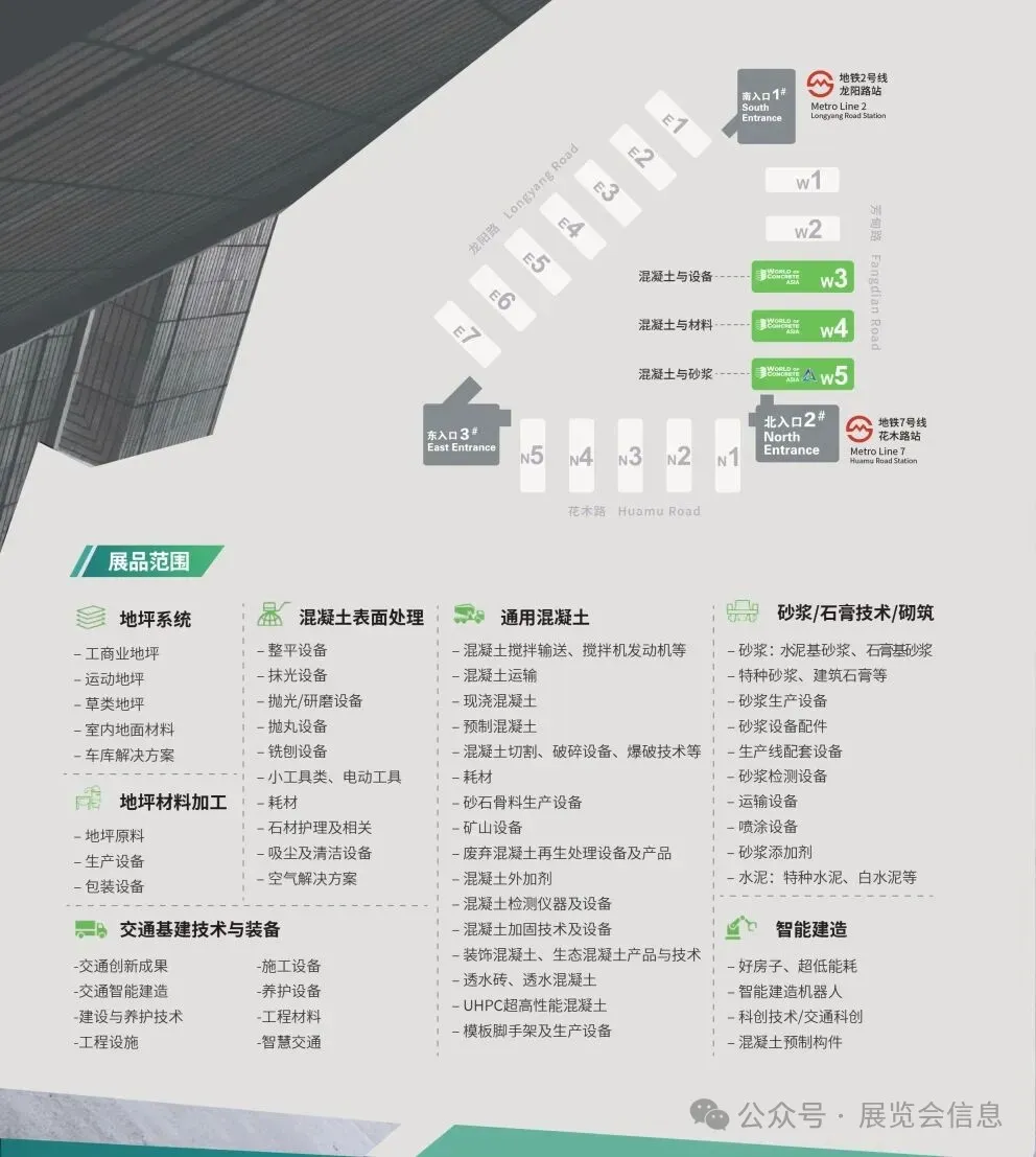 World of Concrete Asia 亚洲混凝土世界博览会作为全球混凝土行业知名的展会品牌“混凝土世界博览会”系列的亚洲站,一站式展示混凝土、地坪、砂浆三大领域的高品质产品与领先技术。展会以混凝土地面建设为中心,向混凝土立面建筑发展,包含混凝土建筑原材料、混凝土建筑添加剂、混凝土建筑及机械设备、混凝土表面处理设备及配件、地坪原材料、多样性地坪系统、成品砂浆、砂浆添加剂、砂浆成套生产及喷涂设备等产品。WOCA已打造成为混凝土、地坪、砂浆行业一站式展览及贸易平台,推动亚洲地区混凝土建筑行业的绿色发展国际化、多元化的发展。