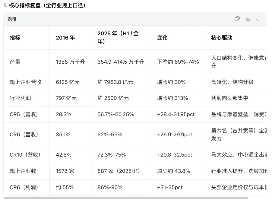 白酒行业惨烈的马太效应最近宜宾市发布了第15个5年计划,计划2030年实现3000亿规模的白酒产业,当前宜宾市白酒产业规模为2000亿,增幅高达50%,年化复合增长率高达8%。 五粮液的市场规模占宜宾市45%左右,如果假设这个利润不变,按照政府规划2030年五粮液的营业收入将达到1350亿,净利润高达500亿+。 在当前白酒哀鸿遍野的现在,估计没人会相信五粮液能取得如此的成绩! 本文就回顾一下过去10年白酒产业的发展(数据来自豆包,可能不准,但是大差不差),来论述宜宾市的产业政策是否值得期待。