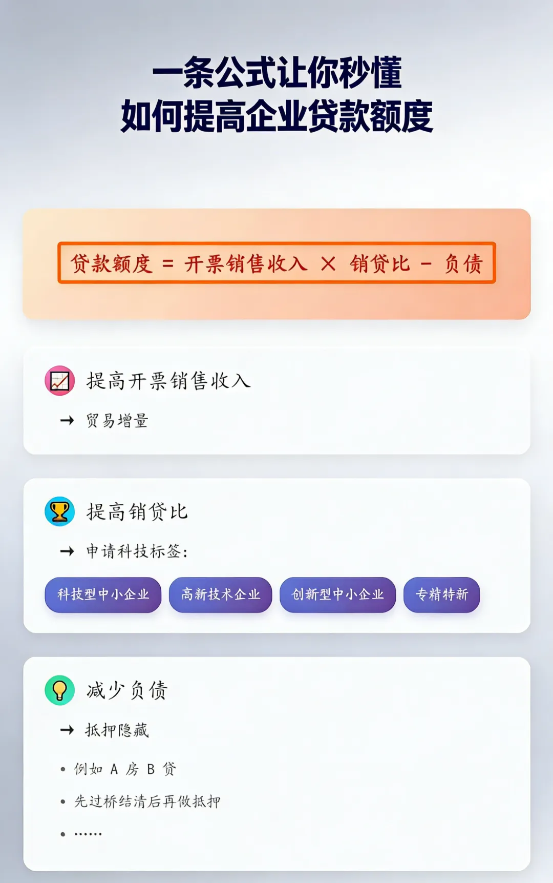 贷款额度的本质,是 “企业实力(收入 + 资质)” 减去 “现有压力(负债)”。按这 3 个方向调整,额度提升不用愁!