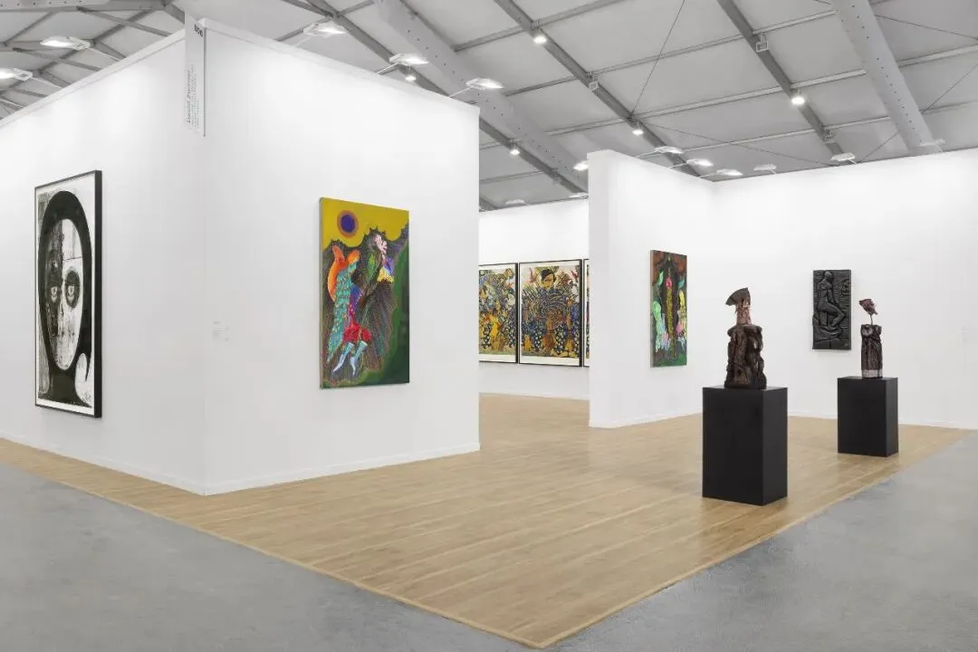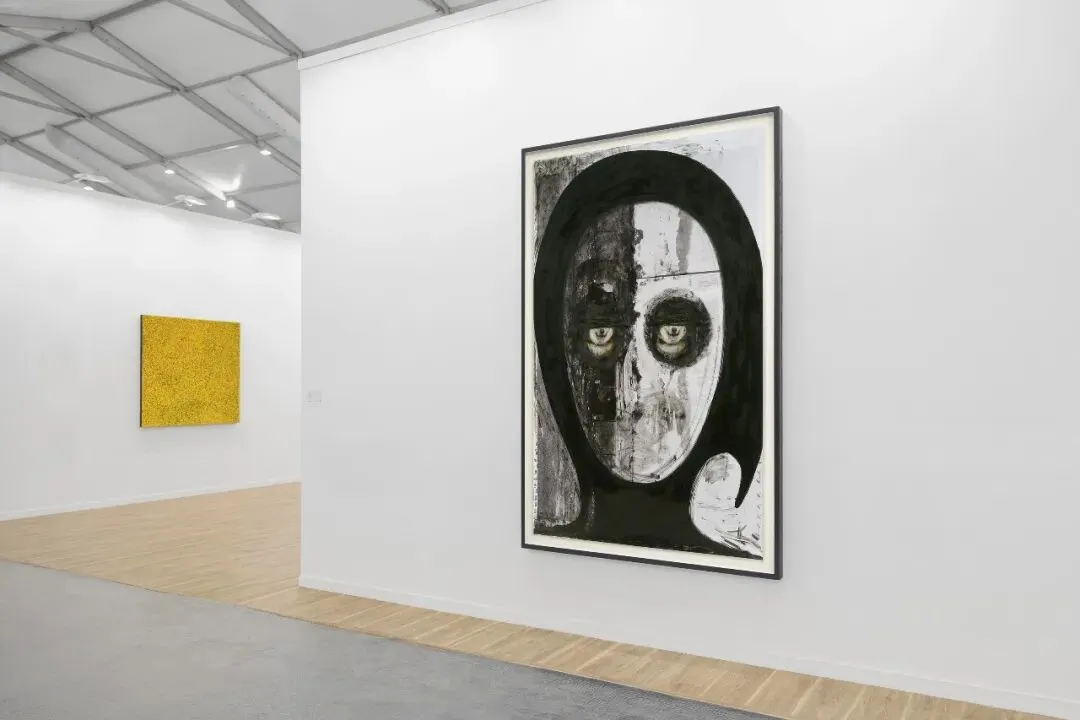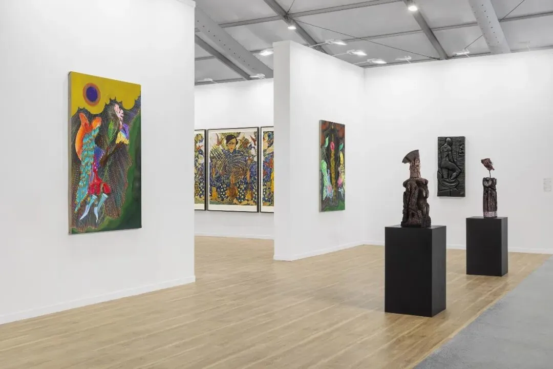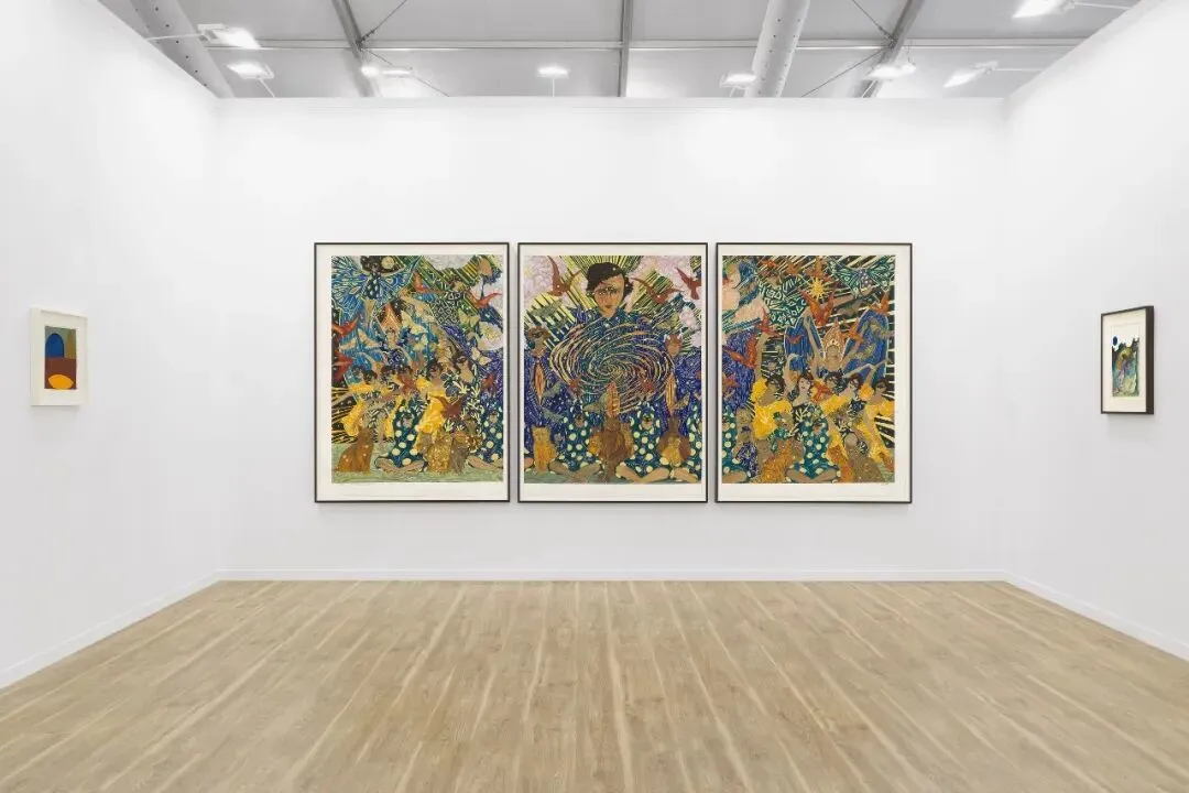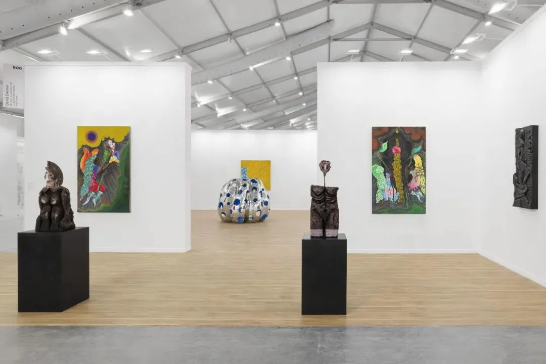 ■ 卓纳展位B06,印度艺术博览会现场,2026年;作品从左至右依次来自:胡玛·芭芭(Huma Bhabha)、克里斯·奥菲利(Chris Ofili)、草间弥生(Yayoi Kusama)、胡玛·芭芭、克里斯·奥菲利、迈克尔·艾尔米塔什(Michael Armitage)。