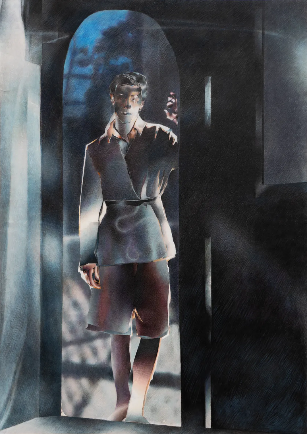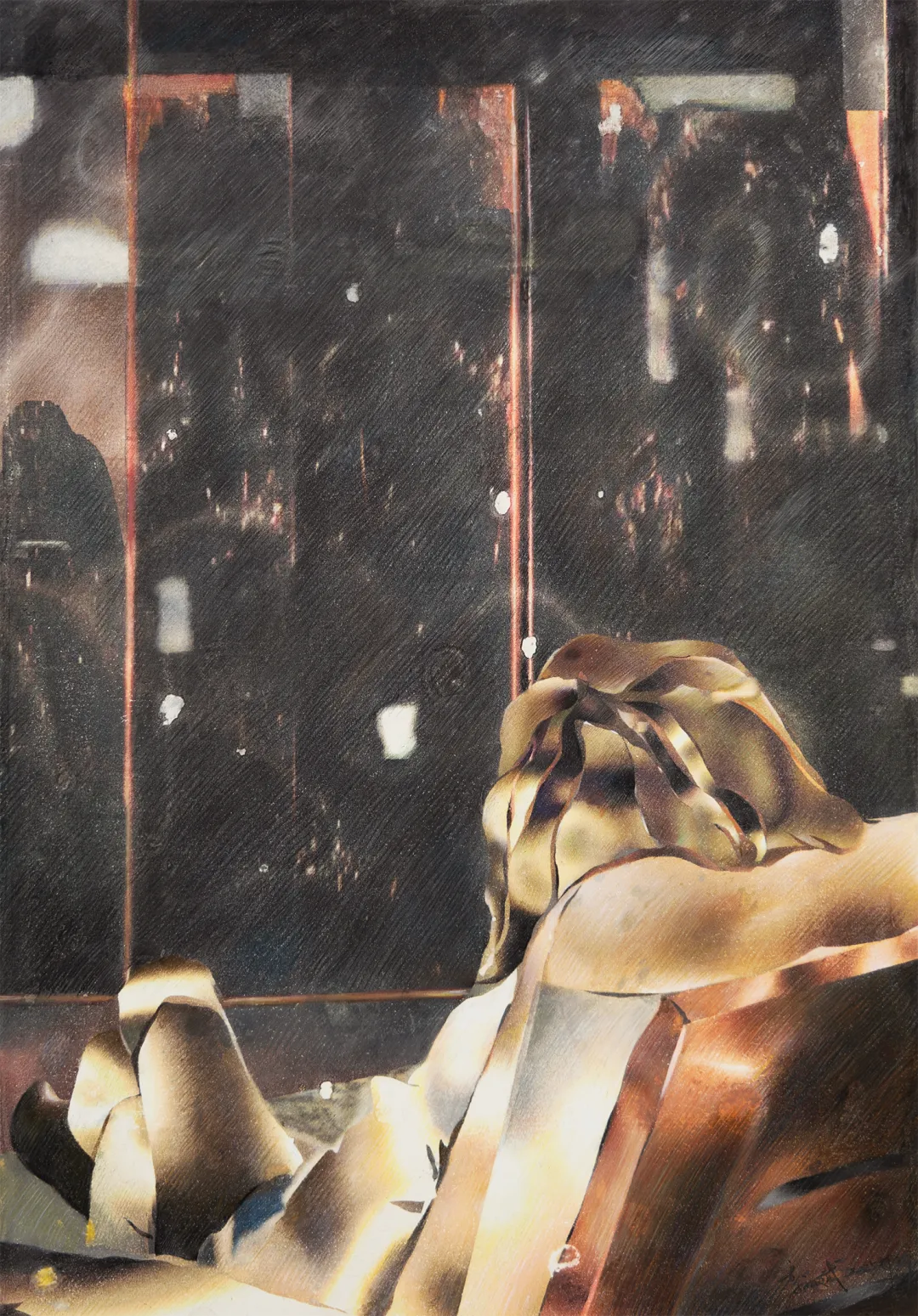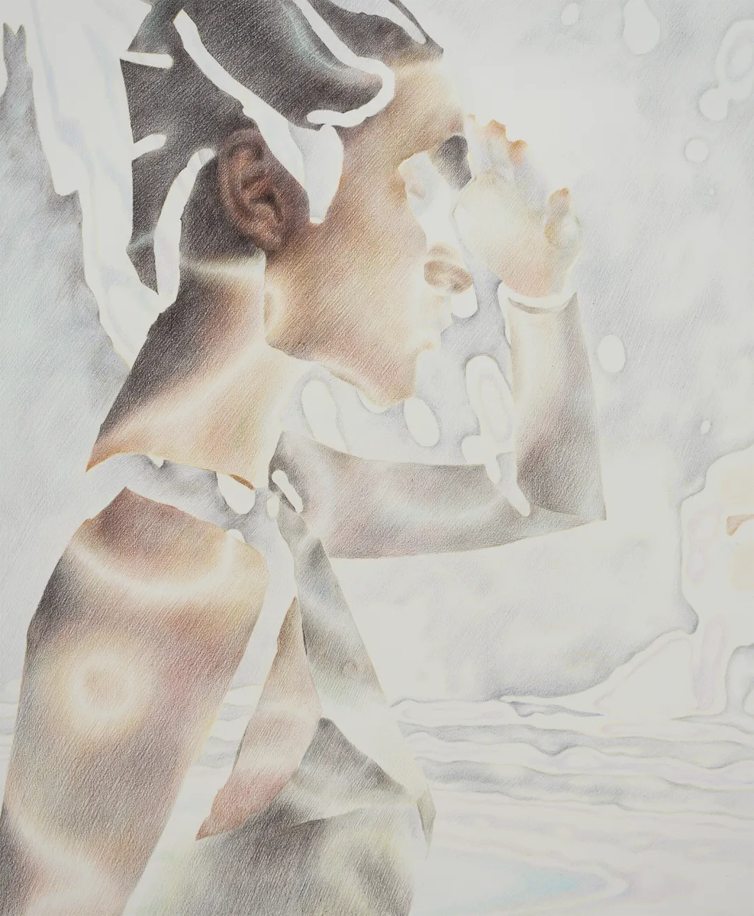 彩铅、色粉与水彩作为艺术家长期使用的主要媒介,使这种状态得以被细致保留下来。画面以略带断裂的方式展开,不同的人存在于私密空间中,记忆、感受与现实同时出现。细密的线条构成人物形体,色彩被水稀释,刻意在身体表面留下光斑,让人物看似失去重量,逐渐趋于半透明。情绪与意识取代了关注的焦点,成为画面中不可能被忽视的感受性存在。