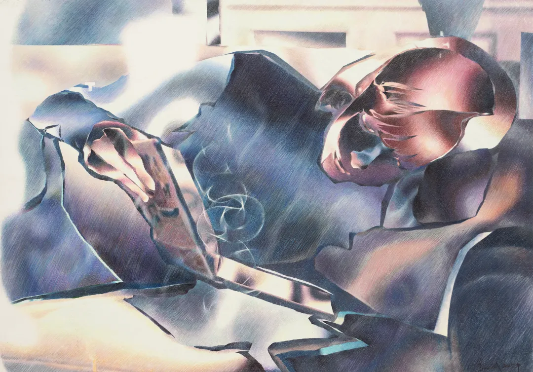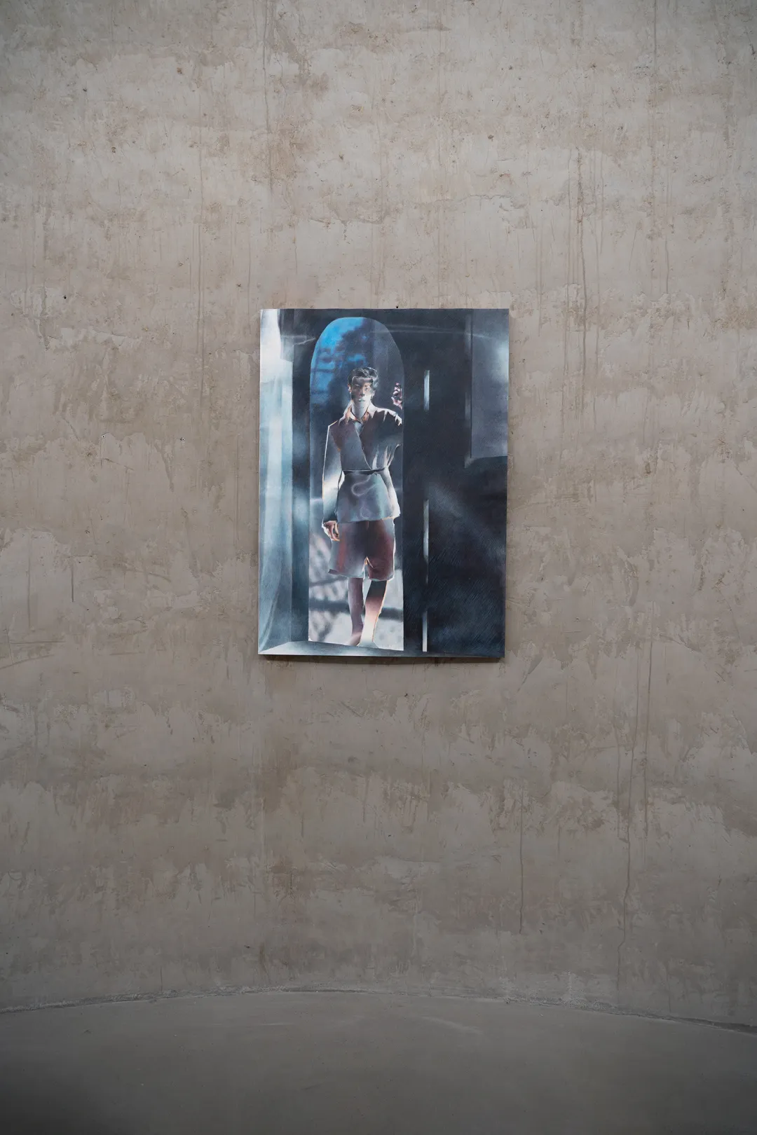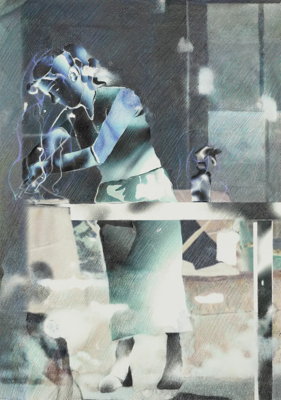 彩铅、色粉与水彩作为艺术家长期使用的主要媒介,使这种状态得以被细致保留下来。画面以略带断裂的方式展开,不同的人存在于私密空间中,记忆、感受与现实同时出现。细密的线条构成人物形体,色彩被水稀释,刻意在身体表面留下光斑,让人物看似失去重量,逐渐趋于半透明。情绪与意识取代了关注的焦点,成为画面中不可能被忽视的感受性存在。