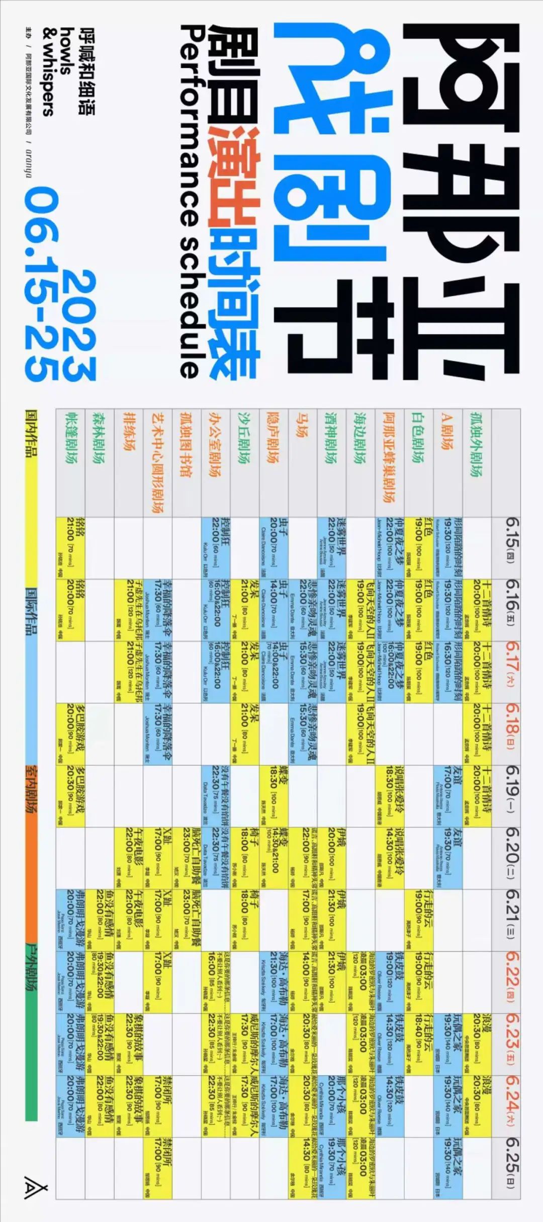 本届阿那亚戏剧节将于2023年6月15日至25日在阿那亚·黄金海岸社区举办,由孟京辉、章子怡、陈明昊联合担任艺术总监。