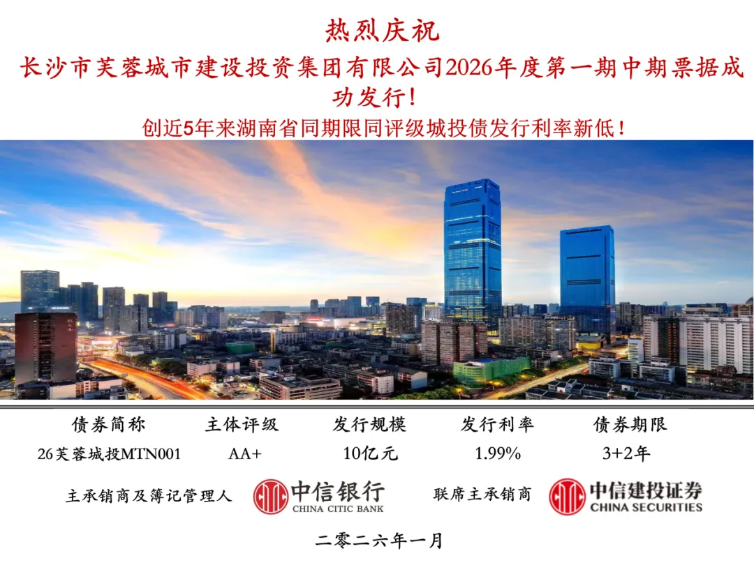 近期,芙蓉城投集团在资本市场实现新年融资“双响炮”,以历史最优利率成功发行10亿元中期票据及10亿元公司债券,双双创下湖南省同评级、同期限债券利率最低水平。