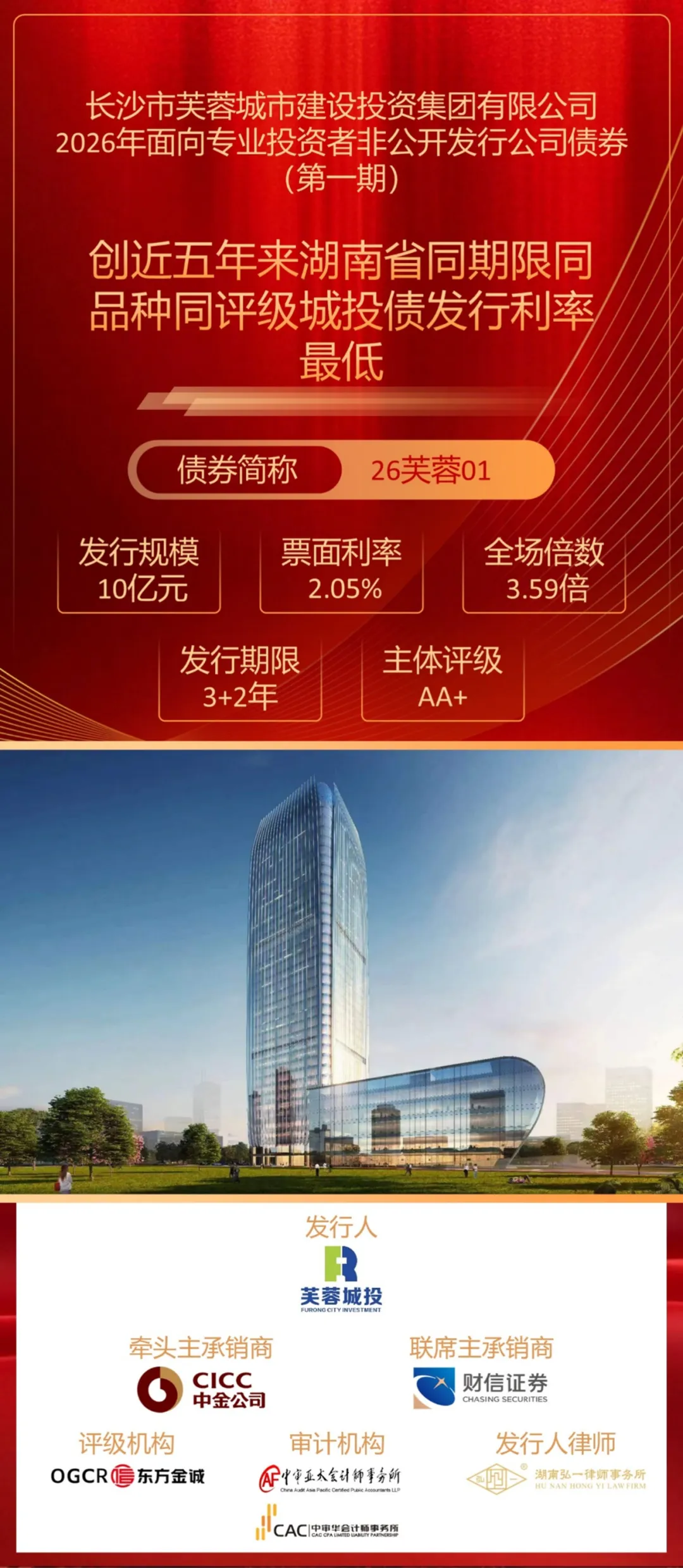 2月6日,芙蓉城投集团乘势而上,再次取得突破性成果——成功发行“26芙蓉01”公司债券,金额10亿元、期限3+2年,票面利率低至2.05%,获得3.59倍全场超额认购,创下近五年来湖南省AA+城投企业3+2年期一般私募公司债发行利率新低。