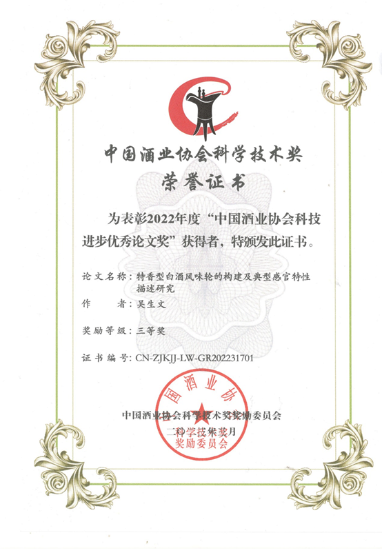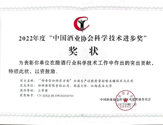 其中,四特酒《特香型“四特东方韵”白酒生产过程质量控制关键技术与应用》项目荣获2022年度中国酒业协会科学技术进步三等奖,《特香型白酒风味轮的构建及典型感官特性描述研究》荣获科技进步优秀论文三等奖。