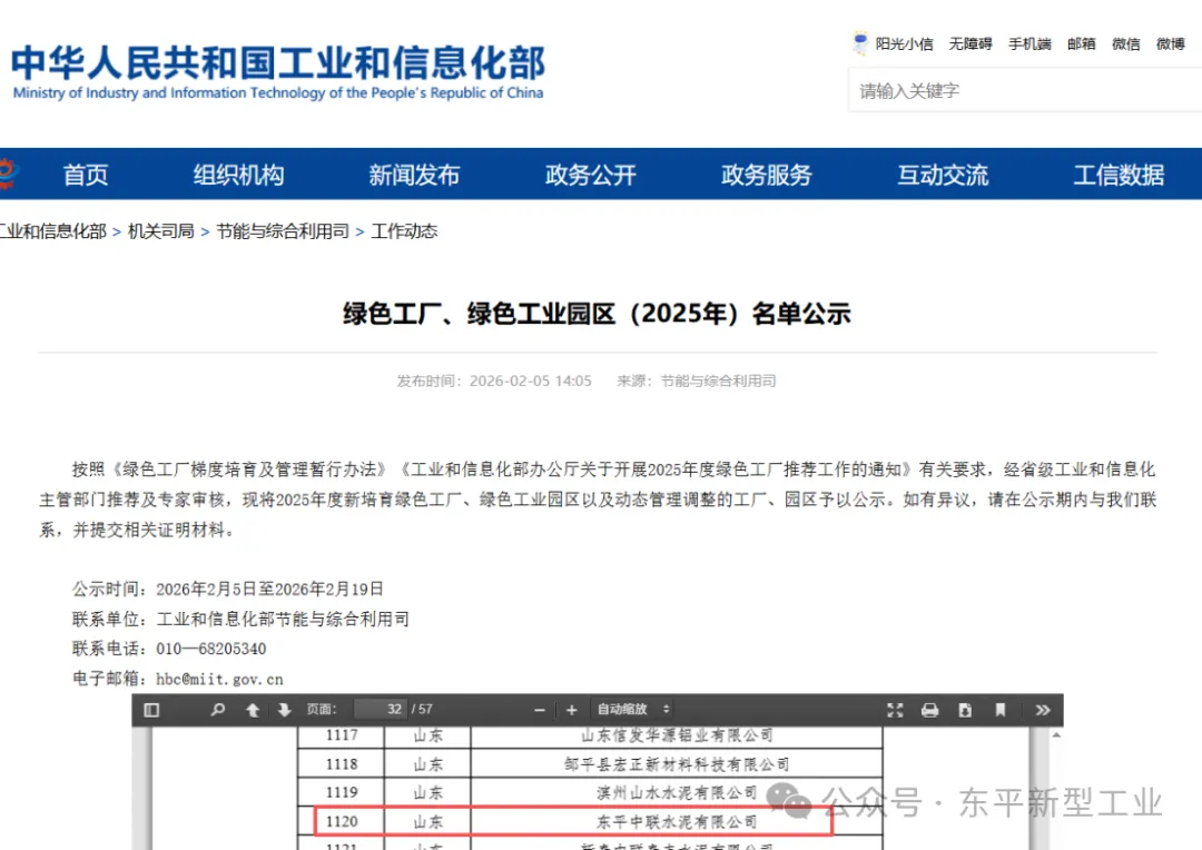 近日,工业和信息化部公示了2025年度国家级绿色工厂、绿色工业园区名单,我县东平中联水泥有限公司入围国家级绿色工厂,填补了我县此项荣誉的空白。