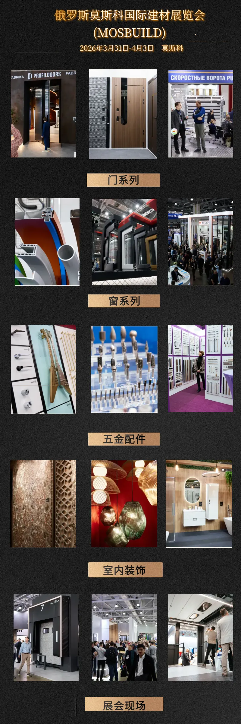 莫斯科建材展览会展品共15大品类,涵盖建筑、建筑翻新和建筑装饰的各个阶段,作为俄罗斯及独联体地区规模最大的综合性建材展,展会汇集了主流采购商、开发商、大型承包商设计师、建筑师、工程商及分销网络。