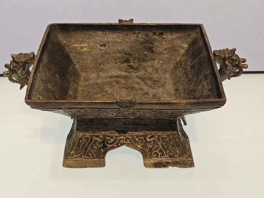 元代铜簠为官方祭祀礼器,造型严格遵循商周古制,器身回纹简约,风格庄重规整,以祭祀功能性为核心,维系儒家礼制正统。