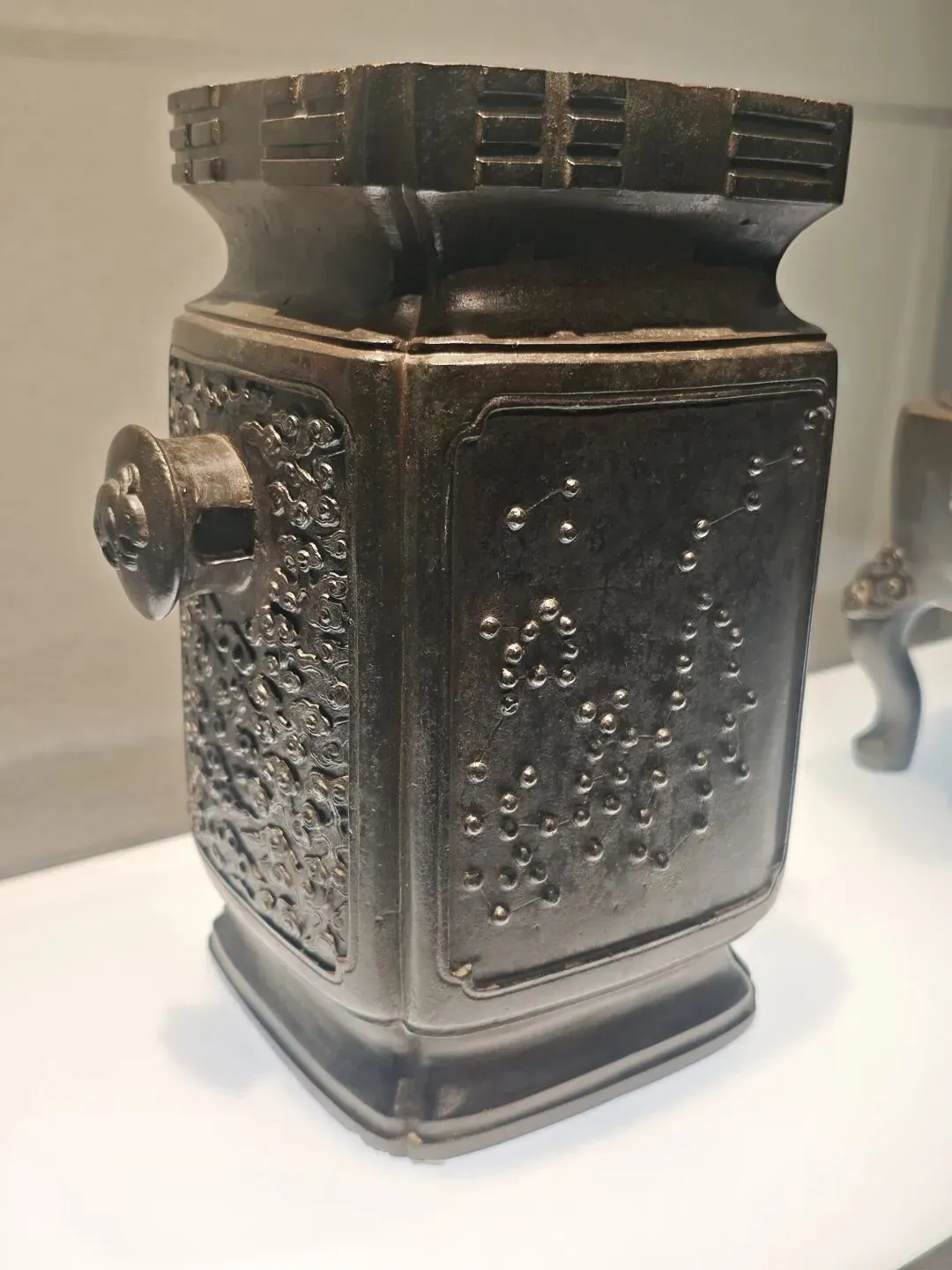 清代星斗纹天一山人铜丹壶与仿古纹铜方壶,更是将古铜之雅推向精神层面:星斗纹融合道教宇宙观,与八卦纹结合象征“汲取星辰之力”,从炼丹的宗教符号,转变为文人书斋雅玩,承载着文人对秩序与永恒的精神寄托;仿古纹铜方壶循古制而造,成为案头清供,让古铜雅意融入文人日常。