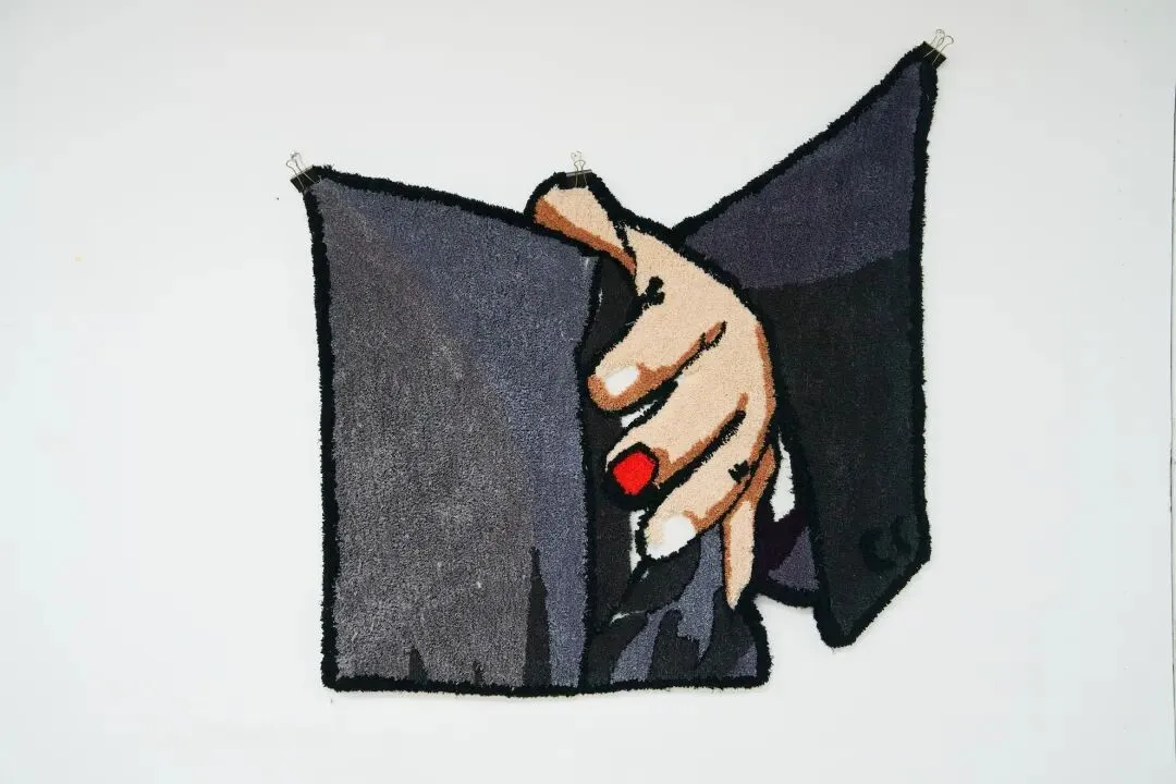 英语习语“Sweep under the rug”(扫进地毯下)意指掩盖丑闻、隐藏真相或回避问题。艺术家选取了一个被主流叙事试图迅速“翻篇”或“抹除”的历史瞬间,却用极其耗时、重复扎刺的Tufting工艺将其重新显影。地毯原本的功能是覆盖地面、吸纳灰尘与噪音,而在这里,地毯本身成为了“噪音”的载体。那只手原本是权力的交接或无奈的告别,被转化为毛绒的触感后,产生了一种荒谬的舒适感。这种“柔软”是对残酷现实的讽刺性包裹——我们将尖锐的政治创伤编织成了客厅里可以被轻视、被踩踏、甚至被抚摸的装饰品。这不仅仅是关于那个瞬间,更是关于我们如何被规训去“舒适地”与那些无法言说的历史共存。