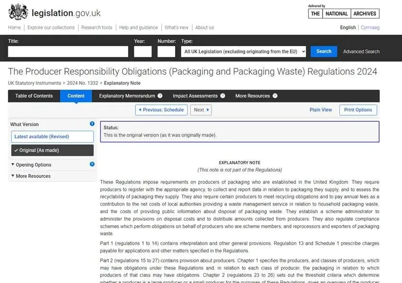 英国自2025年起施行修订后的《包装及包装废弃物生产者责任义务条例(2024)》 (Producer ResPonsibility Obligations 2024,简称PEPR),并将在2026年正式运作包装延伸生产者责任制度。