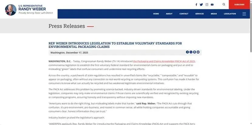 《包装与循环经济法案》(PACK ACT)于2025年12月17日由美国众议员兰迪·韦伯提出,在行业内引发了剧烈震荡。该法案的核心目的在于统一全美范围内关于“可回收包装”声明的监管规定,终结长期以来困扰消费者的标签乱象。